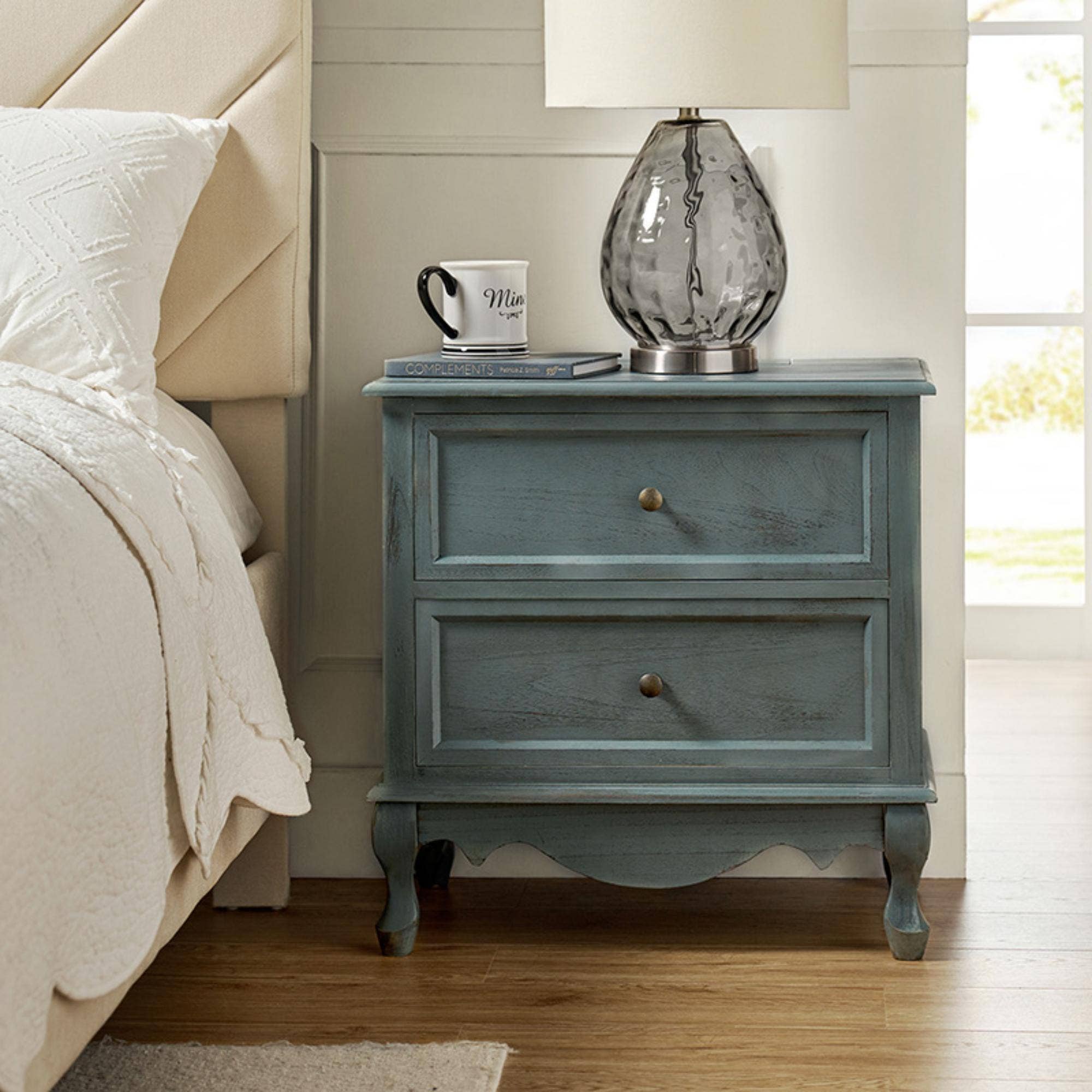 The charming 2-drawer nightstand seamlessly blends farmhouse and transitional styles, suitable for adding a touch of rustic elegance to your bedroom. Constructed from solid wood, it features a warm, natural finish that highlights the wood's grain. The nightstand is adorned with decorative wood trim on the drawer faces, enhancing its classic appeal. Equipped with round ring pulls, the drawers open smoothly to reveal ample storage space. One of the drawers is thoughtfully designed with a built-in charging station and cable management hole, allowing you to keep your phone charged while keeping cords neatly out of sight. The nightstand stands on elegant spindle legs with cushioned pads to protect your floors. Whether you're aiming for a cozy country vibe or a transitional look, this versatile piece blends seamlessly into any decor, making it an addition to your bedroom or guest room.