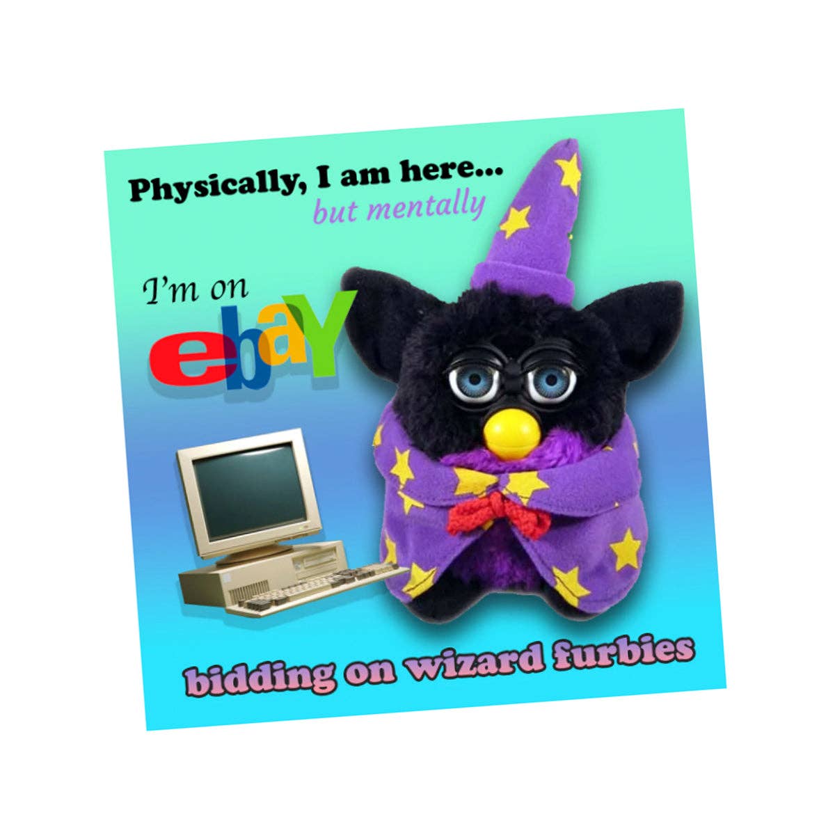 No reviews for Physically, I am here... Wizard furby! XL Bumper sticker. 11 yet.