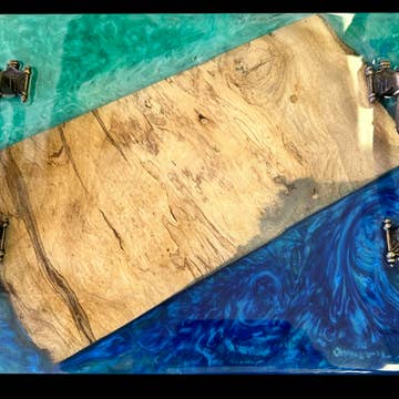 This stunning resin charcuterie board with a captured ocean scene and waves in a gradients of blues will bring Aloha feelings to any home! Made with food-safe, non-toxic resin - right here on Maui. We're all about green choices! We recommend turning the small boards around for any cutting, so that the cutting can happen on the back of the board, and the presenting during gatherings can happen on the front of the boards with the Ocean features - 2 in 1! Care Instructions: Simply wipe with a damp cloth and some dish soap. Scrubbing or dishwasher use is NOT RECOMMENDED. Heat resistant up to 300 degrees. Please do NOT cut on the part of the resin, as it will scratch. MEASUREMENTS: The larger board is approximately 11 x 8 inches. The smaller board is approximately 8 x 5.75 inches