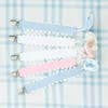 This pacifier clip features a sturdy grosgrain ribbon with charming rick rack trim along the sides for an added touch of texture. The simple design includes a secure metal clasp an a loop for attaching pacifiers or small toys. Its smooth surface is ideal for personalizing with a monogram, making it both practical and customizable.