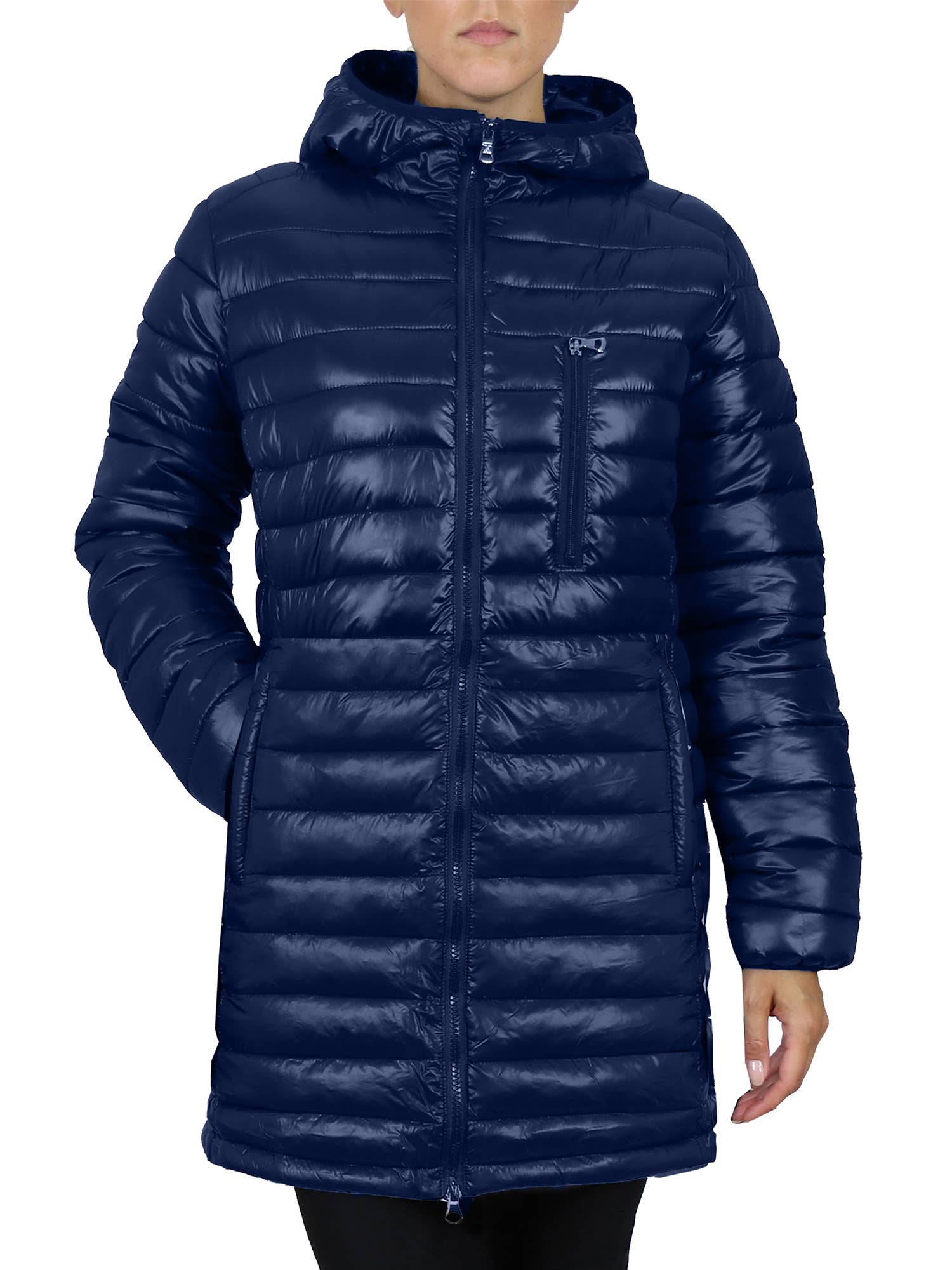 Ladies Hooded High-Low Shirt Tail Fitted Faux Alternative Down Padded Puffer Jacket Has Concealed Zipper Pockets to hold your keys and valuables. Fitted and Light weight to wear running or working out.  Heavy Enough to keep you warm while shopping. Cinch Back and Curved Quilting enhances your shape and silhouette. Made In China Fabrication: 100% Polyester