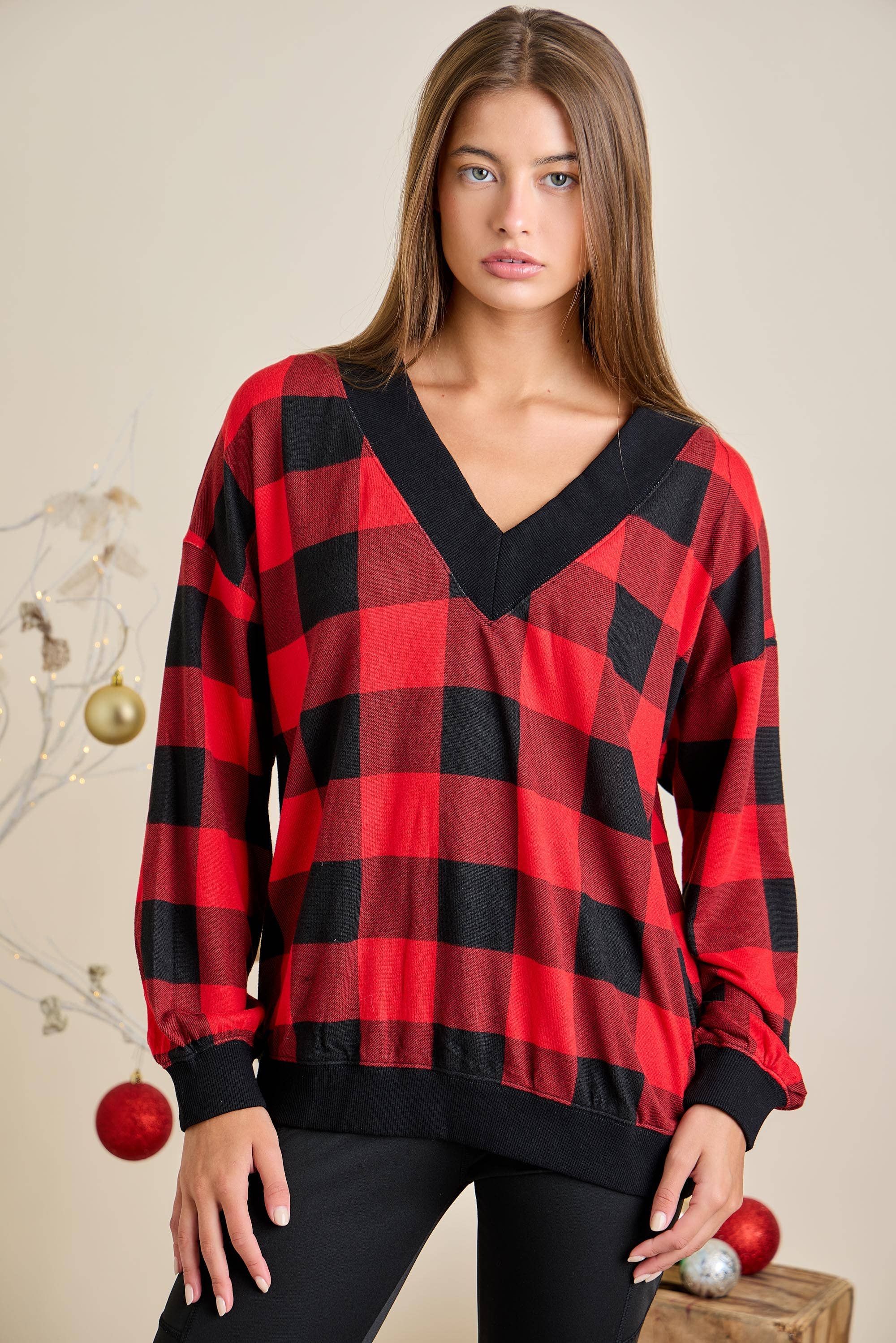 SOLID WITH PLAID CONTRAST LONG SLEEVE. This is the perfect, most versatile, comfortable cozy long sleeve top! It can also be worn by itself when worn with jeans or leggings. You can place your car keys or phone in the functional front pocket! You will be the cutest but most comfortable in this top (Even more comfortable with the matching pants! CP43648 ) Model is 5"10 ft and wearing a size Small. Actual colors may vary slightly due to differences in lighting and monitors.