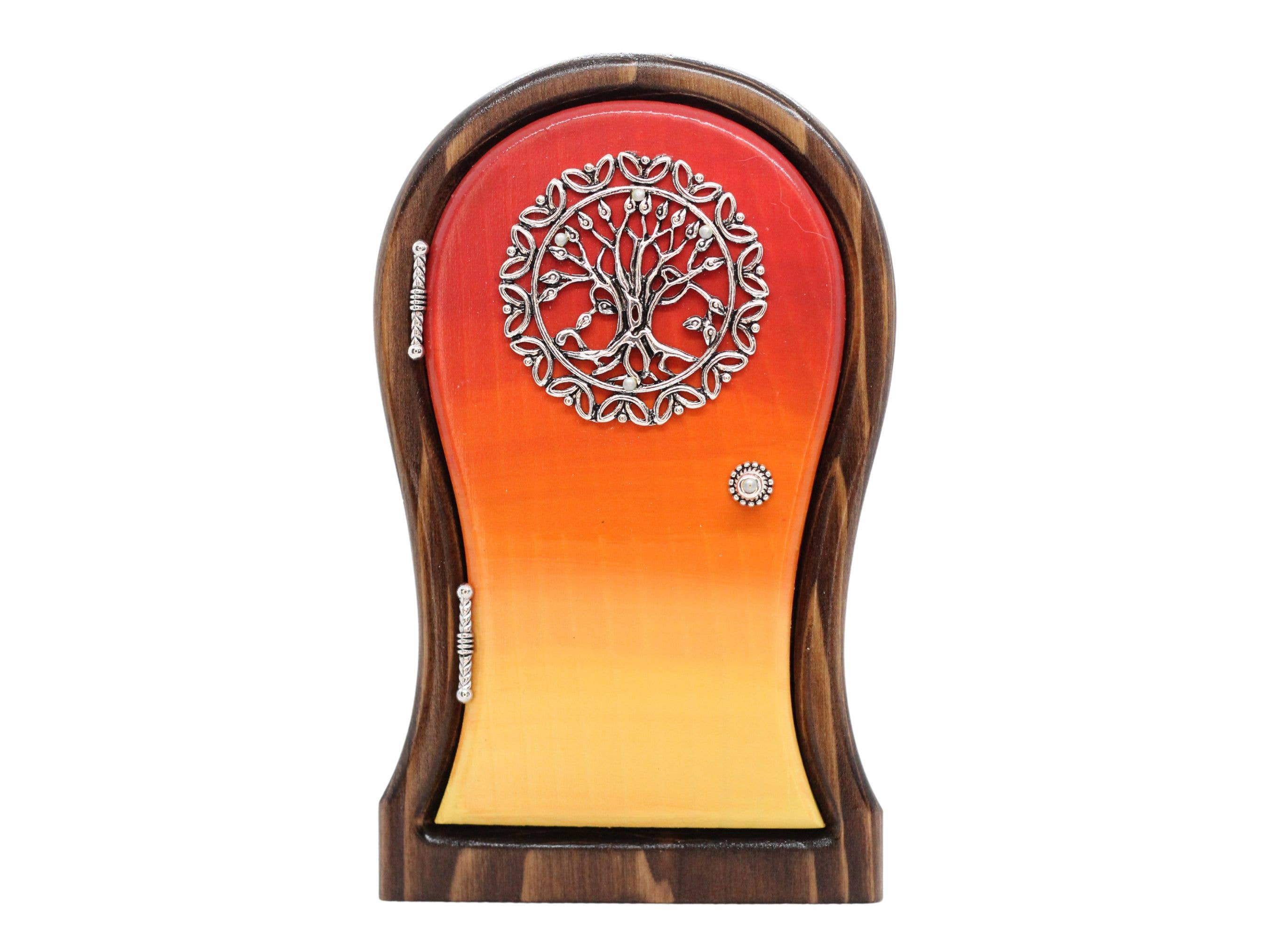 Handmade item Craft: Woodworking Height: 5" Width: 3 1/2" Depth: 1" Materials: Cedar wood, acrylic paint, exterior finish, metal hardware Can be used for indoor or outdoor Each door comes individually packaged in a window gift box. The Wee Doors were designed for the fae known as the Wee Ones. All our doors are handcrafted using only premium red cedar. Cedar is the only wood that can withstand the elements untreated. However, we use an exterior finish to protect the colour from fading over time. The Wee frame has been stained a rich red mahogany. Each little door has been hand painted with acrylic paints. In this case, the colour is an antiqued green. The hardware we choose is either zinc based, copper or bronze. These metals tend to age nicely over time, adding character to the door. A keyhole has been cut into the back of the door to hang from a screw or nail.