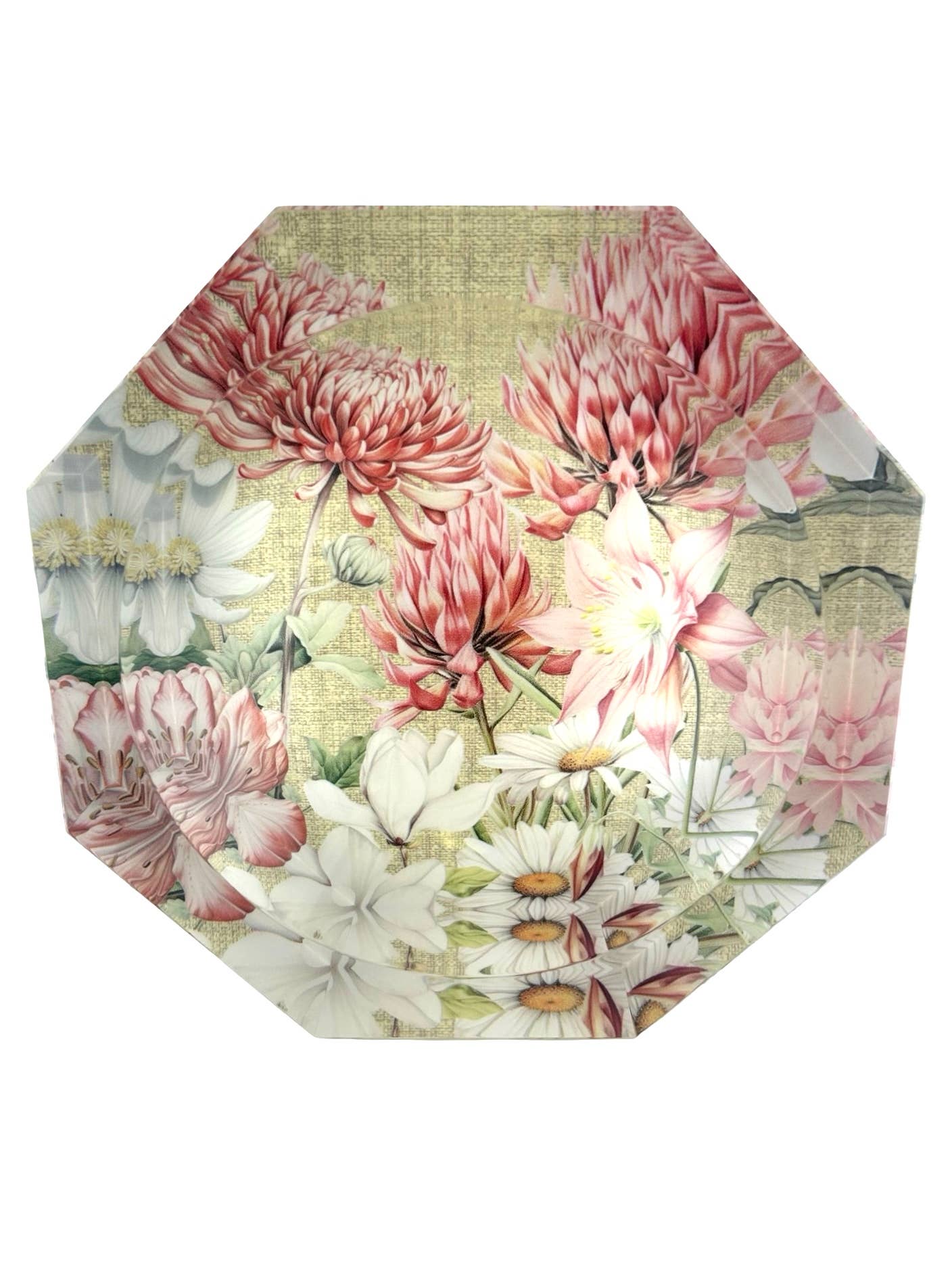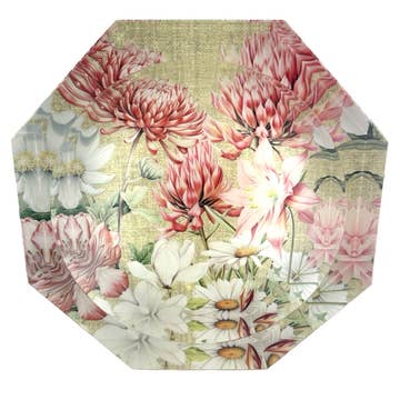 Our Decoupage glass plates are a Marye-Kelley classic. We use high-quality, hand-poured glass made in the USA. The artwork is hand-cut, and Decoupaged onto the glass. The edges are hand-painted in gold or silver. All is done by our artisans in Houston, Texas.
