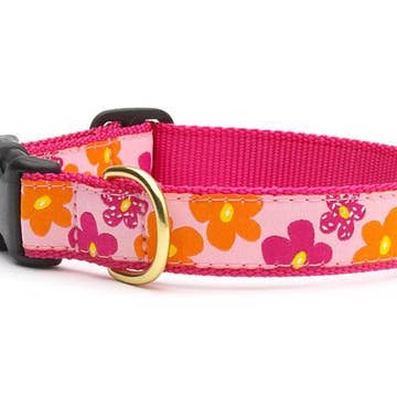 The Solana Collar will brighten your day with it's burst of yellow and scrolling floral design. It is the perfect fit for any stylish, trendy pup. These collars are made with designer fabrics and your choice of either a traditional black plastic buckle or our signature SP metal buckle. The nylon webbing core has a tensile strength of 2100 lbs.
