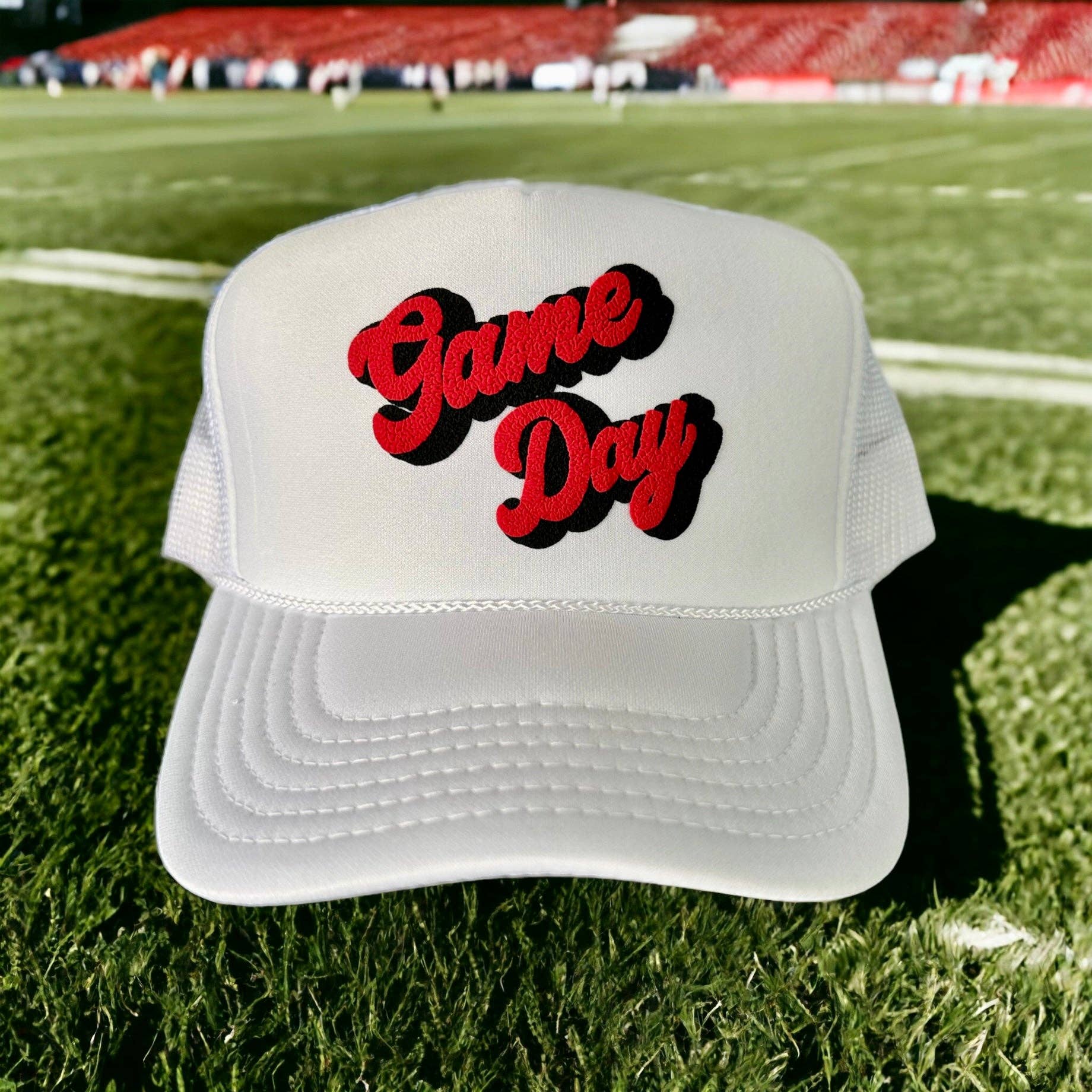 TOT (Tone On Tone) Collection: 'DAWGS' Redon red trucker hat! This trucker hat is a unisex fit. This is a 2D velvet fuzzy design. The hat itself is a foam front with a mesh back snapback. Comfortable fit.