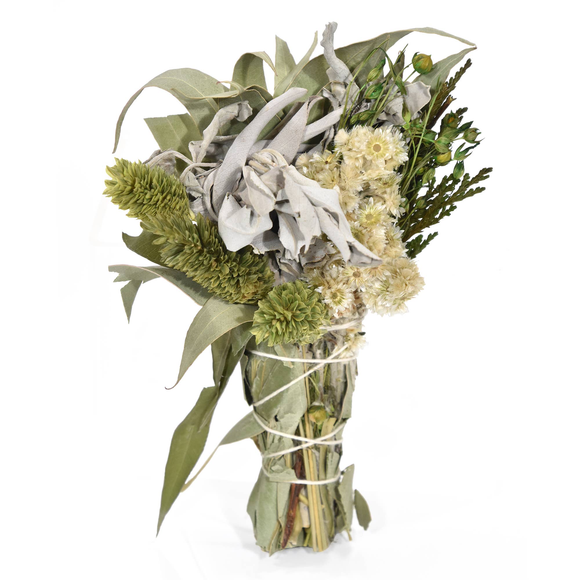Sustainably sourced & Hand-tied in SWFL. These gorgeous bundles make excellent decor & can also be burned to cleanse your space! They are a favorite among gifting & can even be displayed on a small vase or tray. D E T A I L S : -Green Sage -Wildflowers (colors will vary- creams/yellow/lavenders) -Sunflower (not all bundles may feature a sunflower depending on availability) -Yellow Strawflowers -Babies Breath -Cotton String -Tag with floral info (not pictured) Approximately 9" in length *PLEASE NOTE SINCE THIS IS A HAND-MADE ITEM IT WILL VARY FROM BUNDLE TO BUNDLE BUT WE WILL DO OUR BEST TO KEEP IT AS SIMILAR TO THE PHOTOS AS POSSIBLE- COLORS MAY VARY*