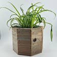 Our geometric multi plank wood planter is one of our favorite planters, but also one of the hardest to make. Using multiple pieces of reclaimed wood, we created a unique shape planter that looks good from multiple angles and shows off plants really well. Due to the nature of the salvaged wood, small imperfections, such as nail holes and or knots add the authentic character of each piece. No two planters will look the same and each will feature different shades of the naturally aged wood. This versatile size planter will hold any of your favorite 4" grow pots and even accommodate the larger 4.25" grow pots. Or, you can plant directly into the planter if you intend on keeping it outdoors, this weathered wood can withstand the elements inside or out. The actual planter measures 5.5" x 5.5" x 4.5" tall. **NOTE - Plants shown in images are reference plants only and NOT included.