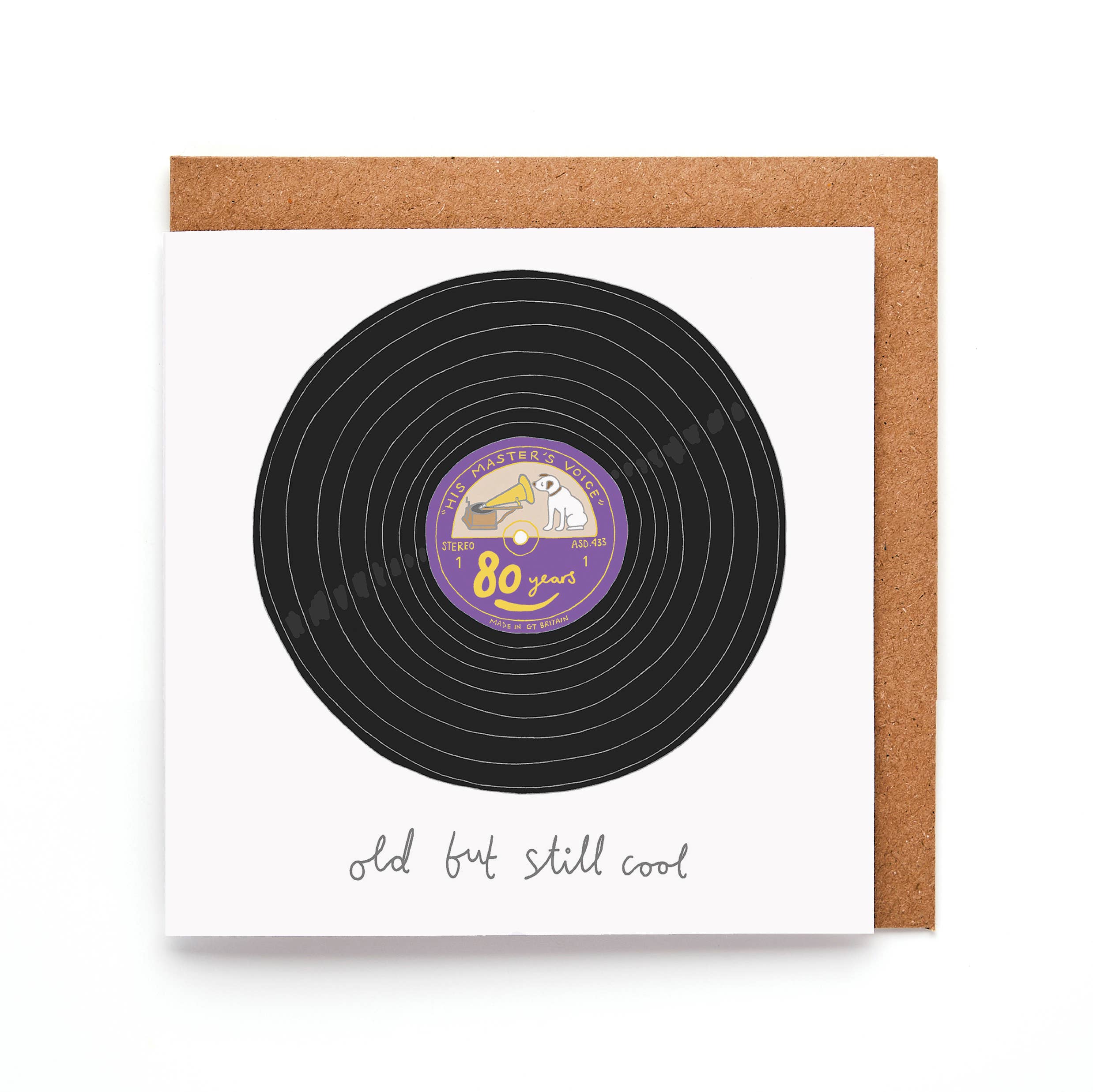 Original, nostalgic birthday card with a bold message. Featuring a hand-drawn illustration of a vinyl record, this witty card celebrates turning 70 with style and humour. The message on the front, written in a playful, hand-drawn font, reads "70 years, Old but Still Cool," making it the perfect choice for music lovers or anyone with a timeless sense of cool. Printed in the UK on FSC-certified premium recyclable paper, this luxury greeting card is blank inside for a personal message. It comes with a high-quality kraft envelope and is part of the best-selling 'Retro Birthday' collection from 'You've Got Pen On Your Face.' Square Card Features: Size: 125mm x 125mm Supplied with Kraft envelope Blank inside 300gsm star-fine white paper FSC-certified acid-free card stock Hand drawn and printed in the UK Packaging options: cello, klasp, or nested. Sold in case of six #Nostalgia