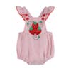 This Red Seersucker Strawberry Ruffle Romper is a sweet little treat for your little sweetie. Detailed with flutter sleeves, bow on the back and intricate strawberry appliqué will make your baby stand out in style! Vibrant buttons at the shoulder allow for size adjustments and snaps on the crotch for easy diaper changes.Â