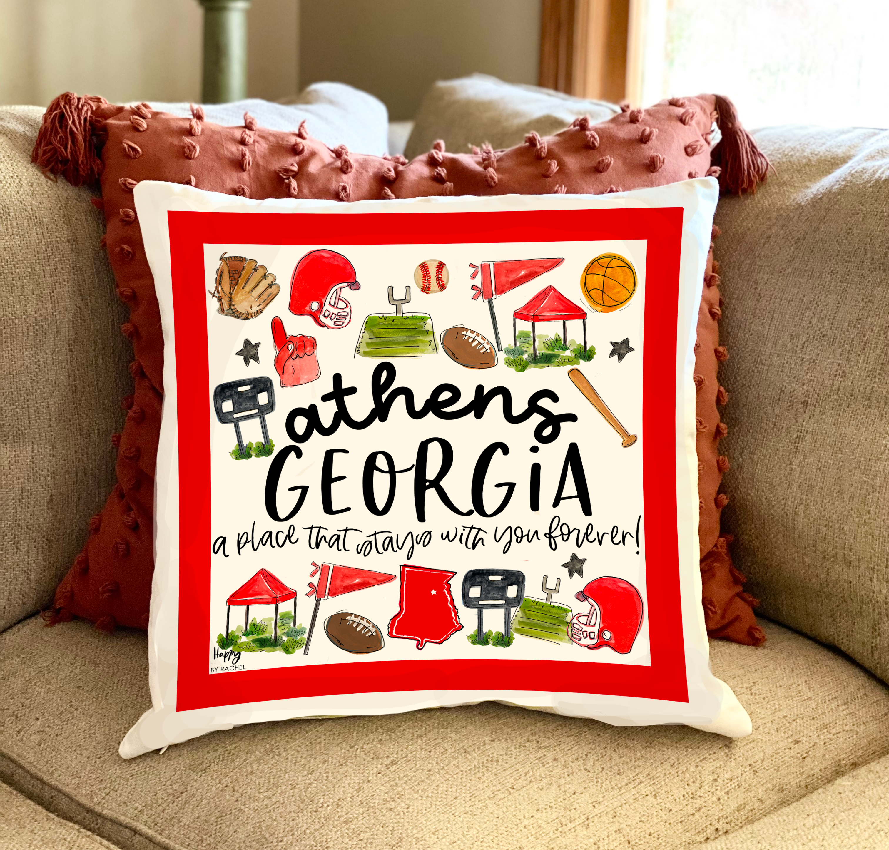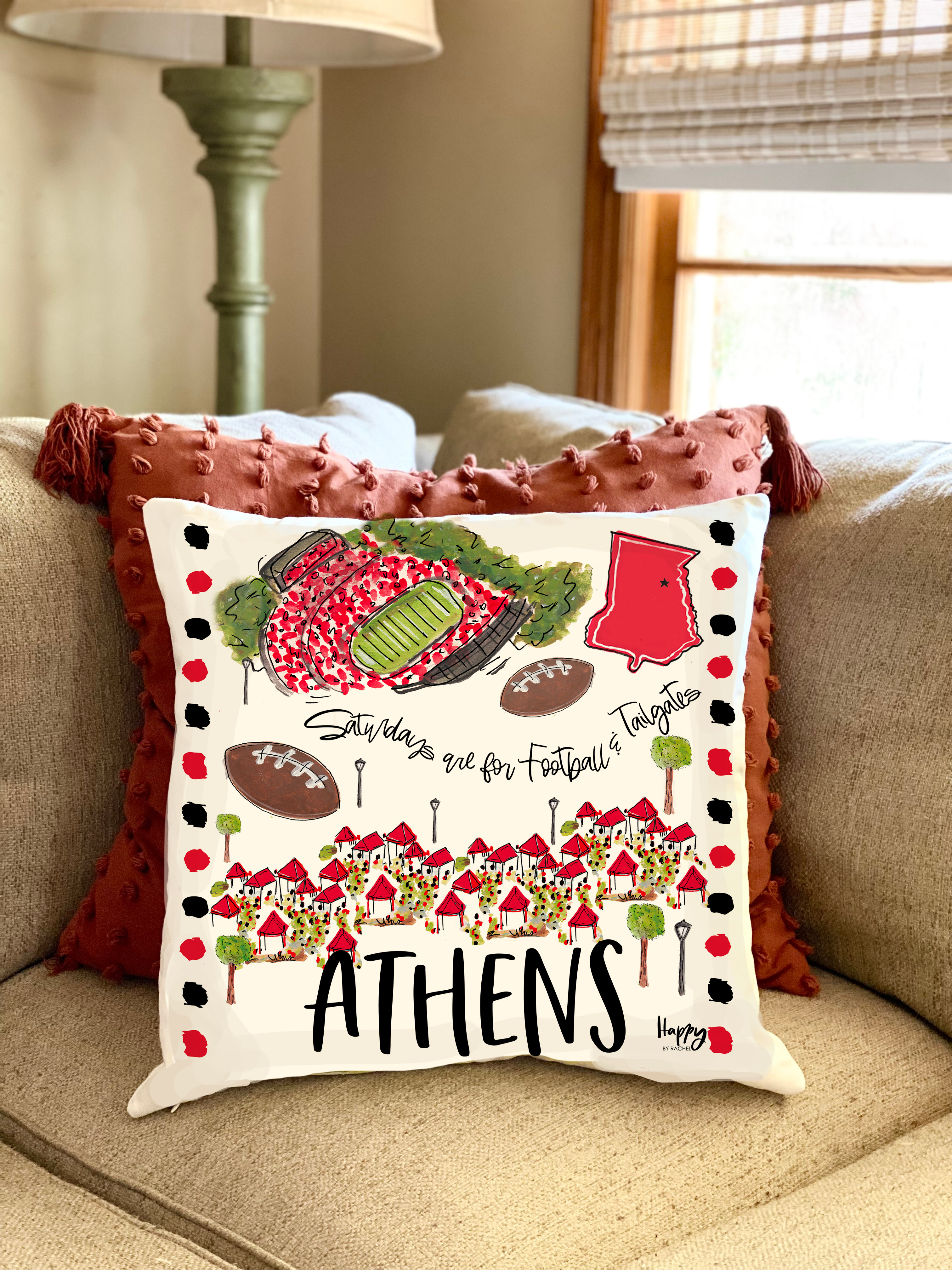 18"x18" Double Sided Pillow displaying custom artwork that makes all the places in Oxford so special on a Saturday! Art by Rachel Walker. Dimension 18"x18"