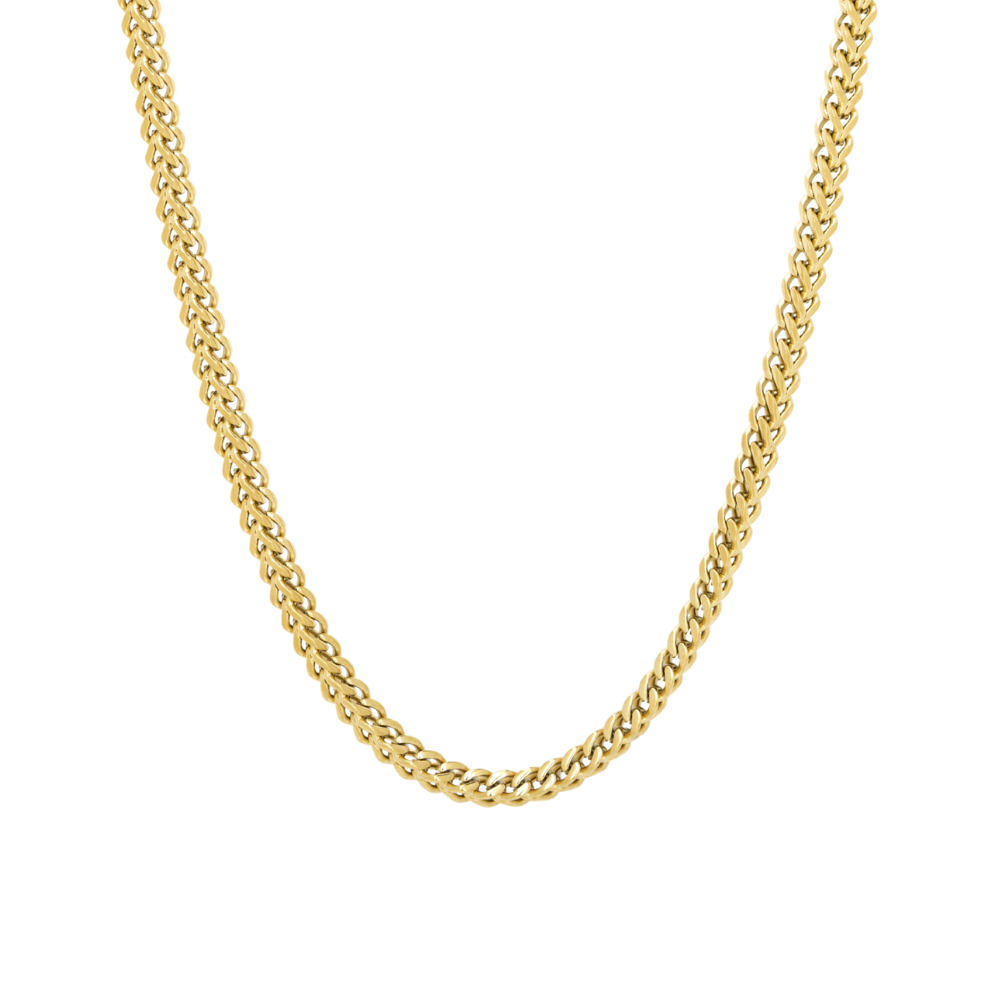 The 18K Gold Franco Chain. Â The newest addition to our Chain Collection. Perfect for layering & ideal for that stand alone statement piece. Â Available in Silver. DETAILS * Thickness: 4MM Â * Closure: Lobster Clasp * Materials: Made from Stainless Steel & 18K Gold PVD Plating * Chain style: Franco * Hypoallergenic SIZE DETAILS The model is wearing a 20" in the single chain image and 18" / 20" / 22" in the three chain image. Available in lengths: 18" / 20" / 22" / 24" QUALITY ASSURANCEÂ This chain is made from Recycled Stainless Steel (Surgical Grade 316L). This chain will not tarnish, rust or turn your skin green. Safe to wear in water & is more durable than other materials commonly used such as Silver & Gold.
