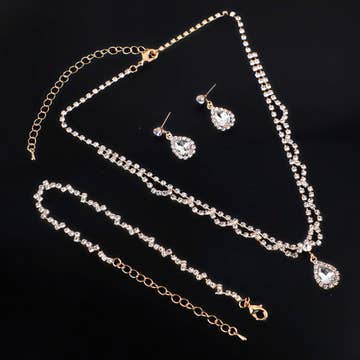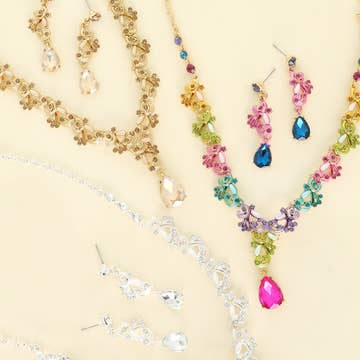 Our popular set is now available in gold!!! This beautiful sparkly gold collection is sure to be a hit with your customers! Incredible quality clear AAA crystals on gold chain. Perfect for any occasion. Necklace is adjustable up to 19” earrings 1.75” bracelet is adjustable