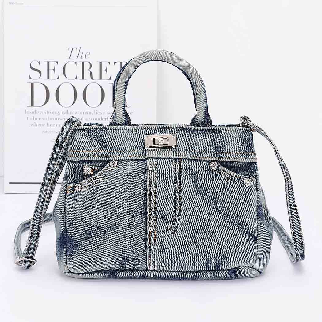 * Denim Crossbody Bag * 9W*7H*2.5D * Denim, Mixed Metal. This handbag showcases a chic denim design. Elevate your accessory game with a bag that keeps your secrets safe while making a bold fashion statement.