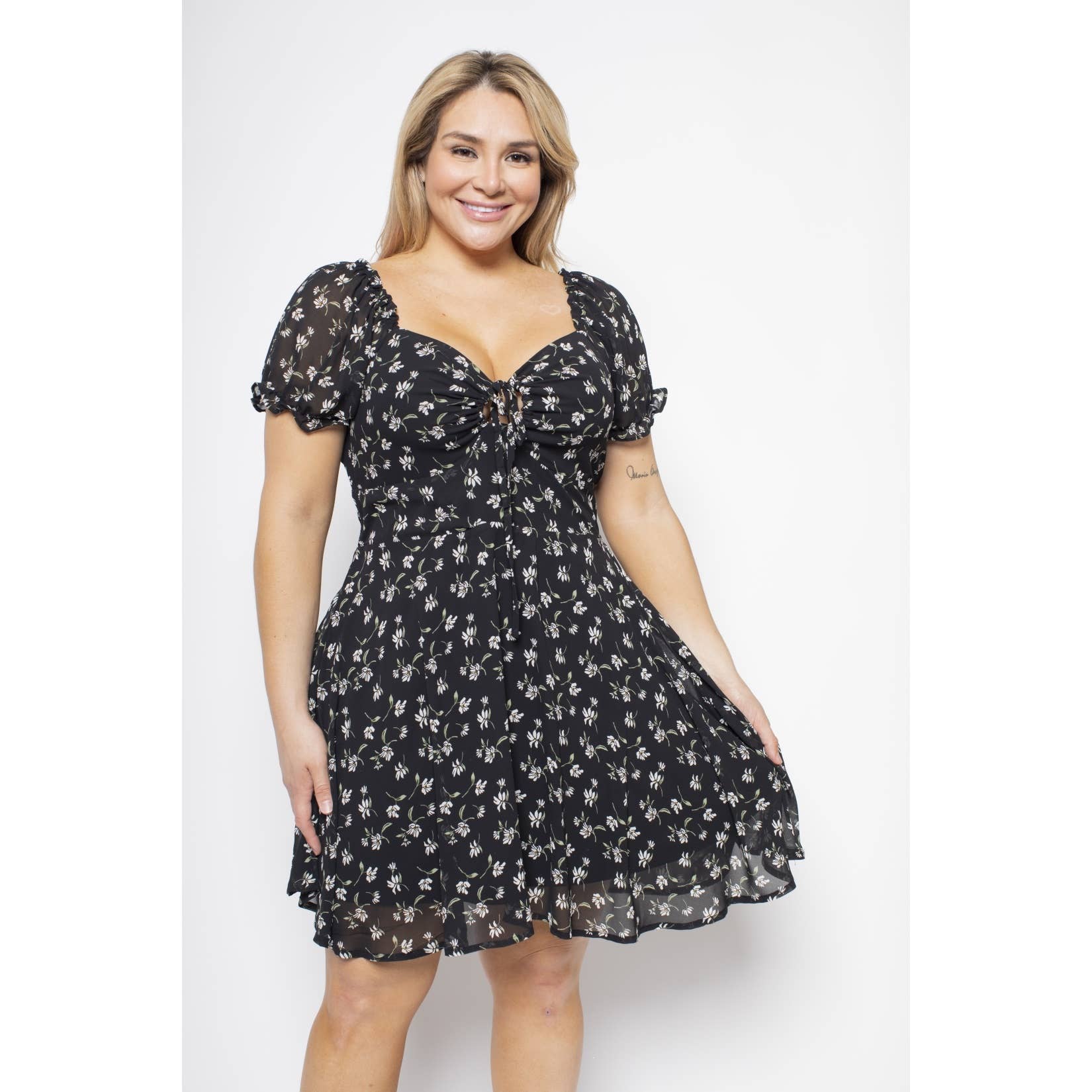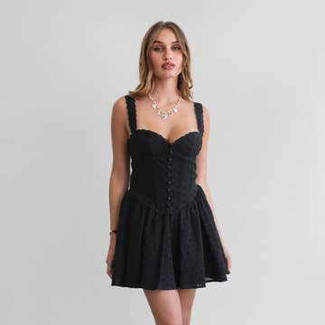 Look stylish in the Vixen Mini Dress. Crafted from Swiss dot fabric, the dress features a bustier top, smocked back panel, adjustable straps and flutter strap for a flattering fit. Perfect for wearing for a special event or night out. Product Details: Fit: The Vixen fits true to size. Length: The Small measures to be 24" from shoulder to hem. Bust: Fitted- smocking allows for stretch. Waist: Not fitted. Fabric: Fabric contains no stretch. Material: 100% Polyester