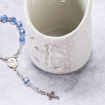 n nthe wrist rosary(TM) by mg rosary is an original design incorporating a complete five decade rosary, just as our blessed mother designed it. The small rosary wraps around the wrist and closes with a strong magnetic clasp. The magnet is easy to operate so you can always be ready to pray. This particular style features sparkling crystals in light opaque rosewater opal with a light ab coating n nplease contact us if you require special sizing. Product attributes nprimary material: crystal, magnetic clasp size: pattern: 5 five decade rosary color: style: 5 five decade rosary bracelet ntype: magnetic rosary bracelet theme: catholic gift noccasion: church.