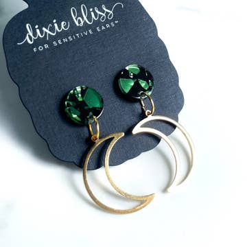Suggested retail for one pair is 10-16! Moon Gazer is bewitching and features: *Venom Green Holographic Acrylic Stud *Vintage Brass Patina Open Crescent Moon *Measures 1.7" from the top *Posts are Stainless Steel *Great for sensitive ears *Made in the USA