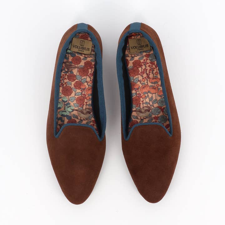 * Navy blue velvet goatskin leather * Brown natural leather crust outsole * 100% cotton inner lining * Soft and comfortable hand-sewn sole * Indoor ballerina made in small series in France