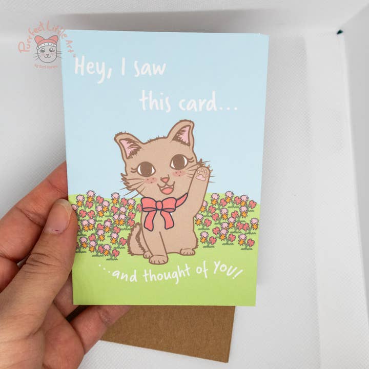 This cute card is perfect for any cat lover, is a sweet way to say "I'm thinking of you". It features a sweet brown cat in a field of flowers. 100% carefully crafted by hand using premium quality materials materials. Each card includes a matching Kraft envelope. SIZE: 5" x 3.5" inches _______________ MATERIALS USED: It is printed on 100lbs cardstock. The premium quality makes the colors vibrant and beautiful. Our cardas are cut and folded by hand, weāre extra careful with every detail and reprint sheets that do not meet our standards, but we cannot guarantee there won't be tiny imperfections in handmade products. NOTE ON SHIPPING Shipping times may vary but allow 1 week turnaround for domestic and 2 weeks for international. Photos are representative of finished product, but due to different monitor settings, there may be slight variations in color.