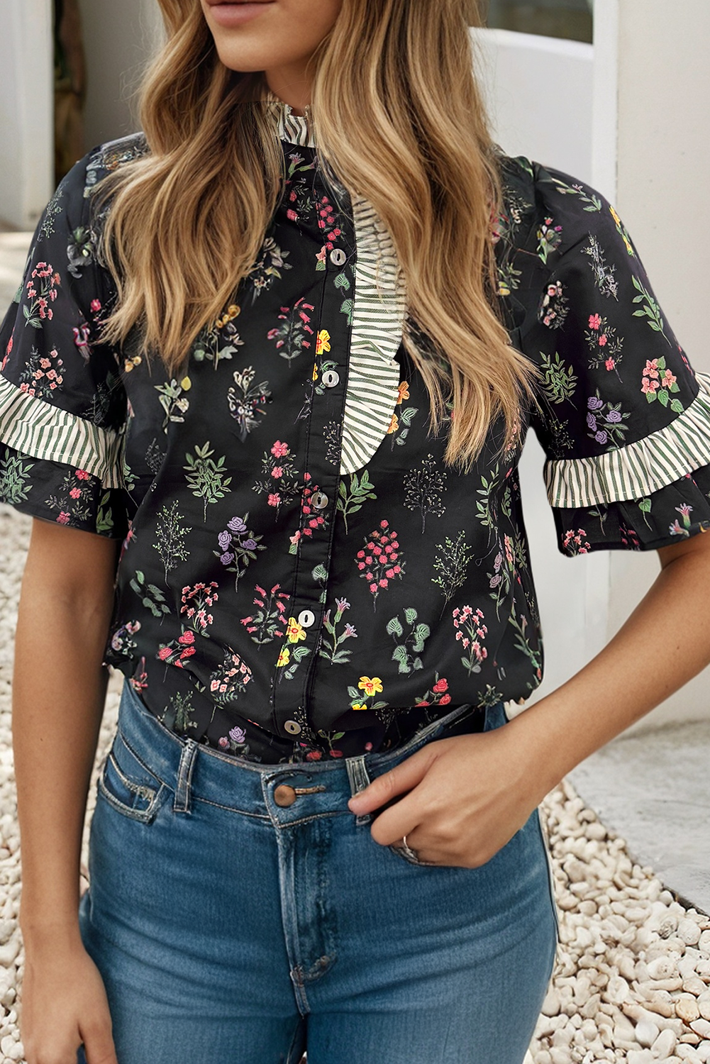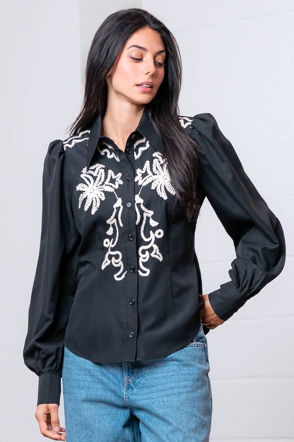 Channel your free spirit and make this embroidered mock neck top your go-to look this season! Airy woven fabric, with darling embroidery throughout, shapes this boho-chic top that has a ruffled mock neckline, button down placket, and long puff sleeves with buttoned cuffs. Embroidered sleeves complete the look. Pair with your favorite bottoms and boots for a look that flatters! + Embroidered mock neck button up top + Ruffled mock neck + Embroidery on front and sleeves + Long puff sleeves with buttoned cuffs + Button down placket + Model is 5' 10.5” 32-24-36 and wears a S