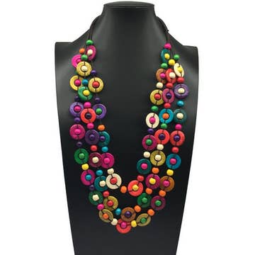 This three strand layered necklace has been made from repurposed wood beads wrapped in recycled sari. Each piece will vary as different colors and patterns of fabric are used to make the beads. Size: Approx. 23" around, plus 3" extender Handmade in India by women artisans working with our fair trade partners.