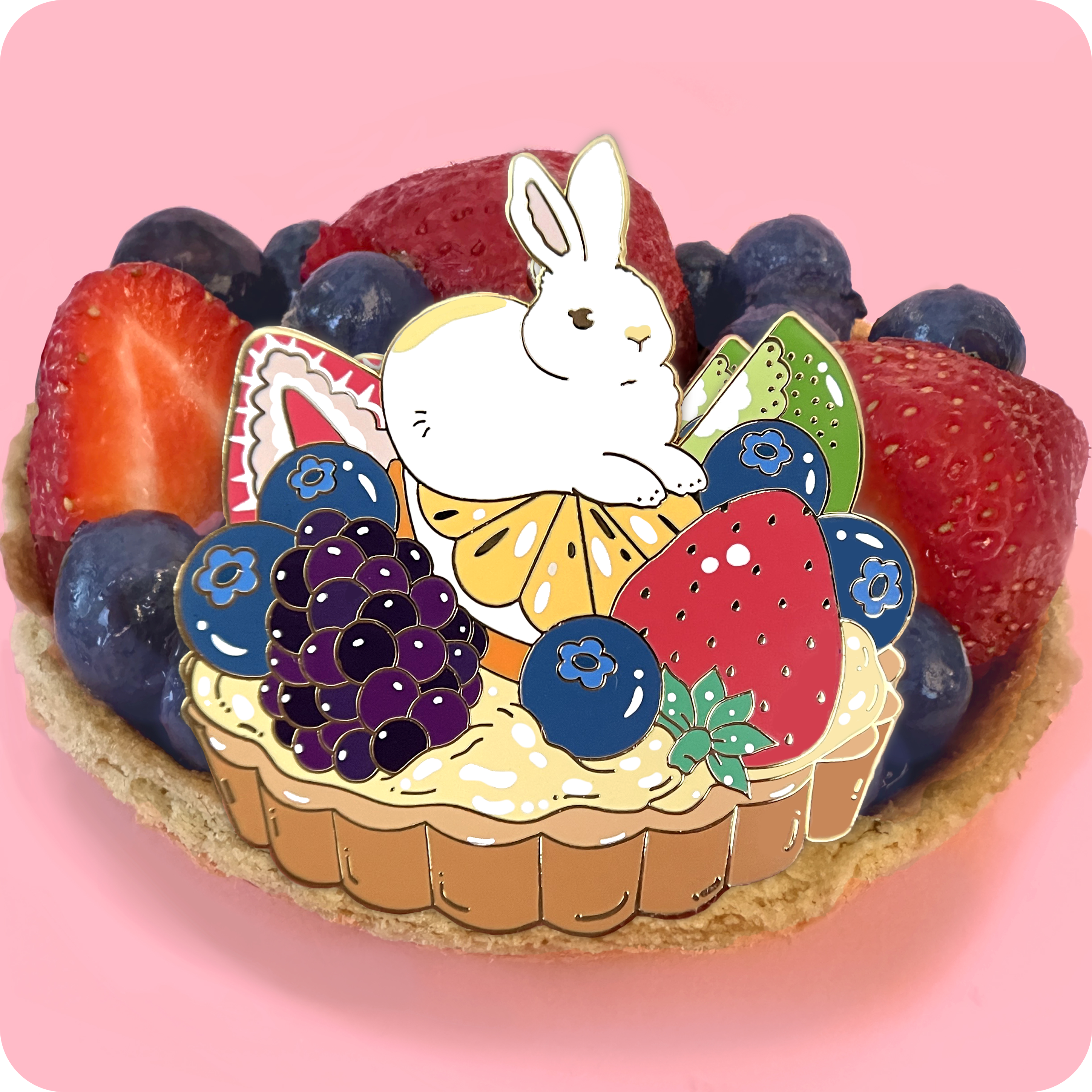 These pastel bunnies are spending a relaxing day amongst blueberries, cherries, and yummy tea inside an intricately decorated cup. ✦ hard enamel pin in shiny gold metal ✦ screen printing details ✦ 1.75 inches ✦ 2 Posts for extra security ✦ Back stamped for authenticity Packaged on a backing card.