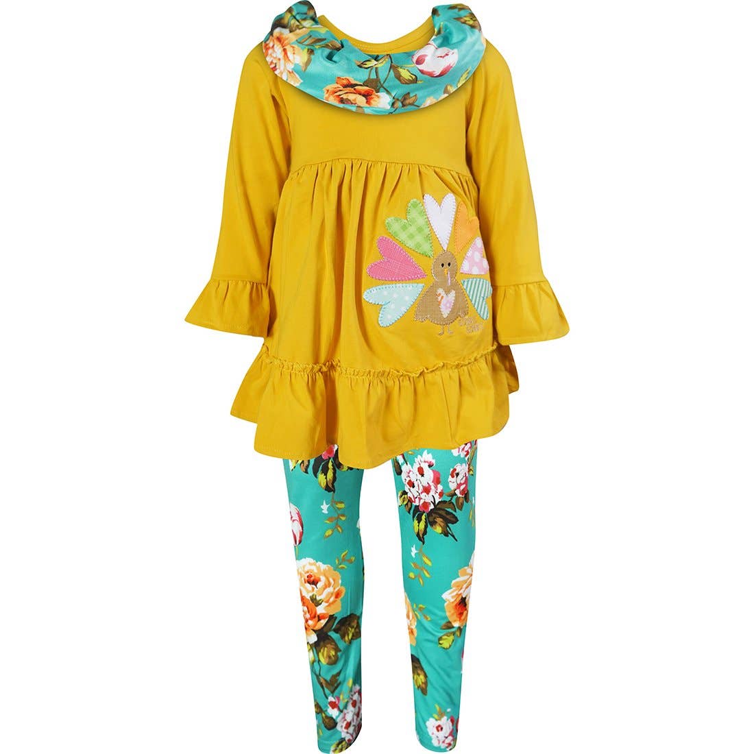 Gobble up the cuteness in our handpainted turkey print! * Long sleeve tunic & legging set * 100% organic cotton tunic, 95% organic cotton/5% spandex legging * Ribbed cotton tunic with spandex jersey legging * Yolk seam with ruffle detail at hem, perfect for twirling * Functional button & keyhole for easy overhead dressing * Elastic waistband for easy dressing & comfort * Made in India * Style # TD32150