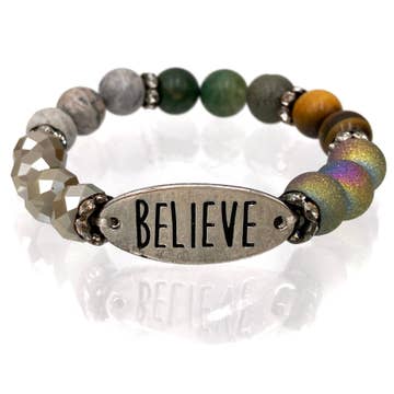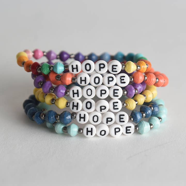 Inspire and be inspired! Empower and be empowered! Our collection of mantra bracelets feature simple words, daily reminders that have the power both to empower yourself and the Ugandan women who craft them. Wear your bracelet as a daily reminder of what's important, knowing that your purchase makes education and empowerment possible for both the mothers who craft the bracelets and their young children. Select one bracelet, a trio or a set of 12. Each bracelet is crafted from delicately rolled paper beads. Paper beads measure approximately .25 inches and are strung on clear elastic to fit most women's wrists.