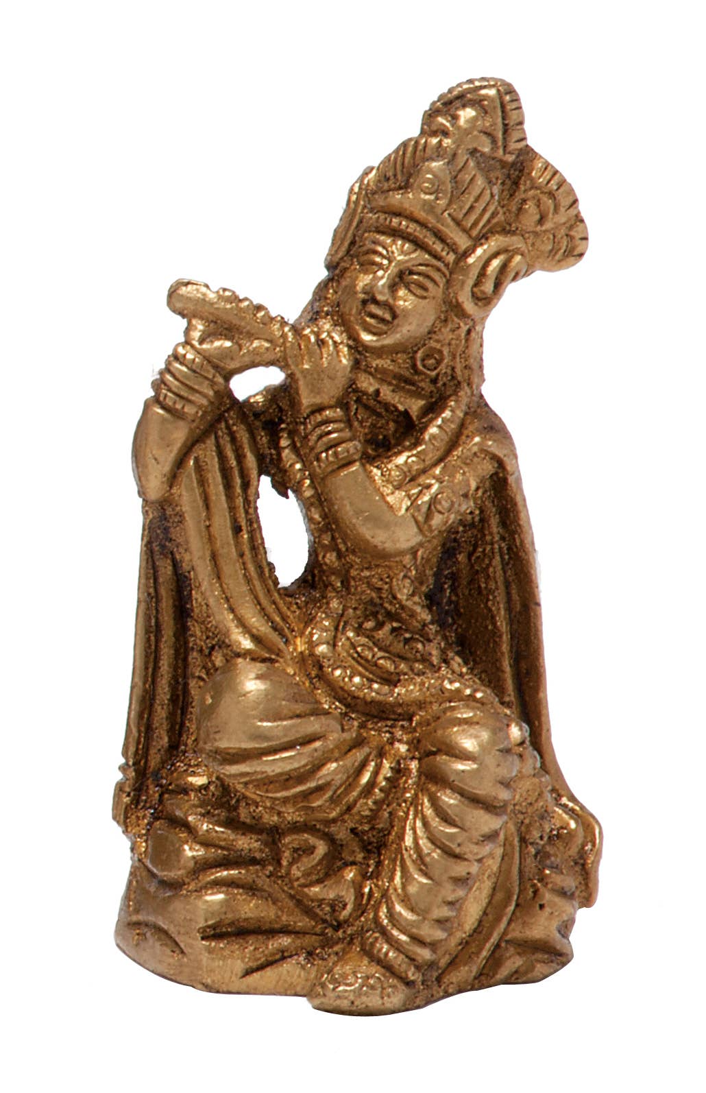 Saraswati, the Goddess of knowledge and music, seated and playing her stringed instrument the veena (or vina). Made of brass in silver or gold tone that we will select for you based on availability. Size: approx 2 inches tall Material: Brass