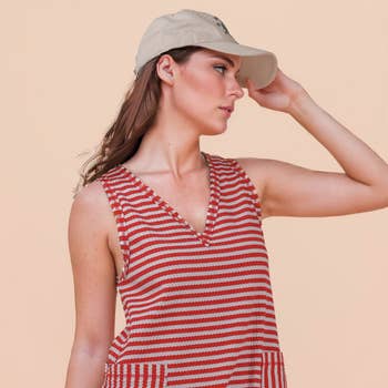 MATERIAL : The jumpsuit is made of 50% polyester + 50% rayon, lightweight and comfortable for all occasions. Features : Jumpsuit, Stripes, Two front pockets, Button front closure, Sleeveless, Loose fit for a relaxed and slouchy silhouette. This shorts jumpsuit is a versatile piece for your closet! VERSATILE: Can be worn with jackets, sneakers, sandals, heels and beach hats. perfect jumpsuit for summer. It's also nice to wear a cardigan over a casual jumpsuit in cooler weather. WEARING OCCASION: This jumpsuit is suitable for vacation/fitness/beach/casual daily wear/travel/work/holiday/airport/shopping/party/outdoor activities/running, it is an indispensable piece in your closet. * Brand labels are not included by default. If needed, please add them via this link ($0.30/pc): https://www.faire.com/product/p_kzks8vegvk