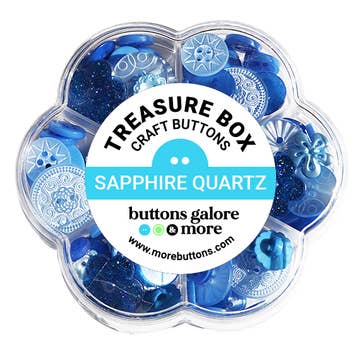 The Sapphire Quartz Treasure Box from Buttons Galore and More contains a variety of fancy designer buttons for your sewing and craft projects. These beautiful, pearlized finished buttons are offered in a crystal clear acrylic flower shaped box and will include various sizes and shapes of buttons. The flower shaped box, with seven different compartments can be used as an embellishment storage container after all the buttons are used on your creations. Includes approximately 100 buttons Contains both sew through and shank style buttons Size range is 3/8 inch to 7/8 inch Sew or glue onto most surfaces Includes a variety of styles and shapes Made from durable polyester plastic Washable and colorfast Clear acrylic flower shaped box is 7 inches in diameter and contains seven compartments