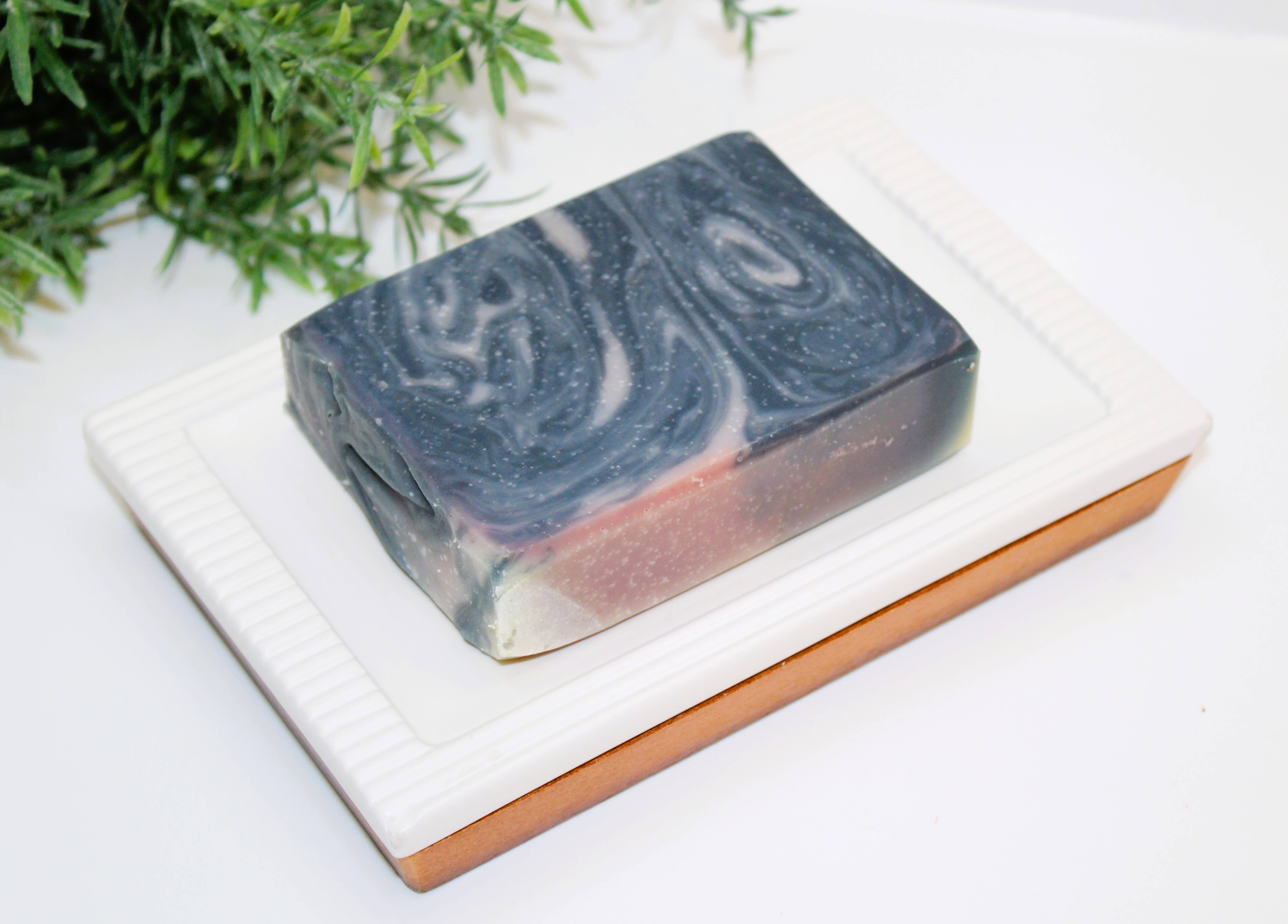 Palo Santo is a handmade vegan soap bar scented with a woody, earthy fragrance highlighted by a blend of warm spice, cedar, and lemon leaf with hints of smoky incense. It contains coconut milk that softens the skin, and cocoa powder and activated charcoal to cleanse. This soap is vegan (no animal products) and doesn't contain any palm oil. Net weight approximately 4.5 oz. All soaps are made by using the cold process method. Bars are hand-cut, trimmed, and allowed to cure for 6 weeks. Because we make soap in small batches, design, weight, and colors vary slightly from bar to bar. Each soap is packaged in a white paper box with a sticker label that includes a soap name, ingredients, net weight, and maker's details. You can repackage the soap to fit your branding. Our soaps are: - made with plant-based oils and fats, vegan-friendly, cruelty-free - colored with natural skin-safe clays, botanicals, oxides, or ethical micas - no palm oils, no parabens or phthalate, no SLES, no SLS