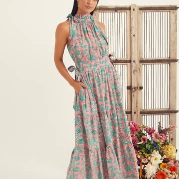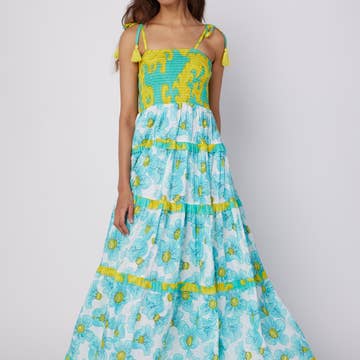 A printed woven maxi dress featuring cami top, peplum, tiered skirt with bare back and tie/tassel Details: Self : 100% Cotton Size & Fit - Model is 5`8" And Wearing Size Small - Measurements Taken From Size Small - Approx. Length: 58"