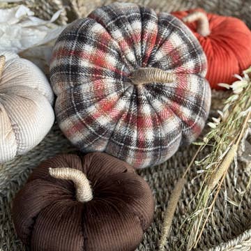 Gathered Mini Pumpkins sells as an assortment of three stuffed fabric pumpkins. Pumpkin comes in an orange, black, or white finish with dried moss, stick stems, and a grungy texture and it looks great paired together or displayed separately. Measures 2.75" high by 1.75" diameter. Please note: This item features a variety of designs which are priced individually, not as a set. When you order a quantity of 24, you will receive 8 of each design. Designs are not interchangeable.