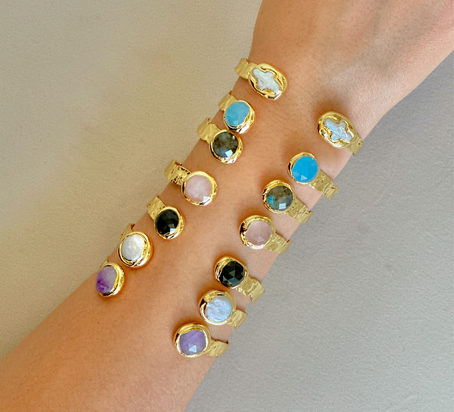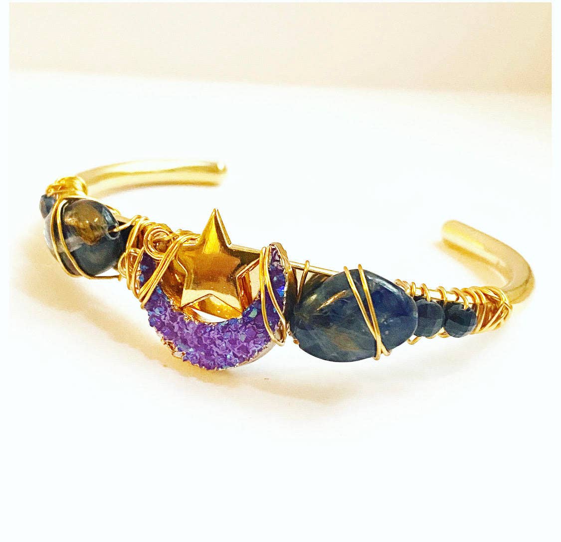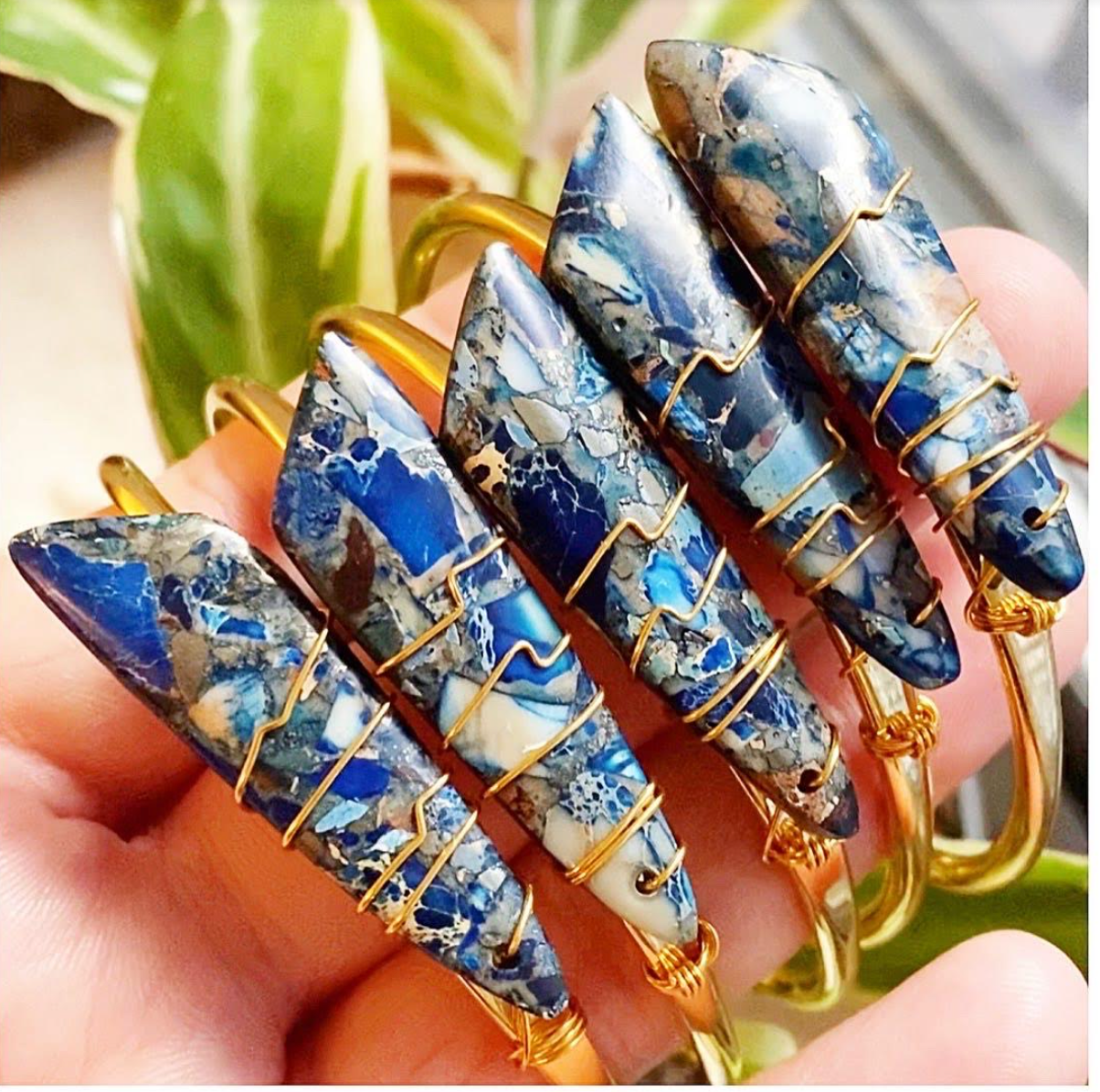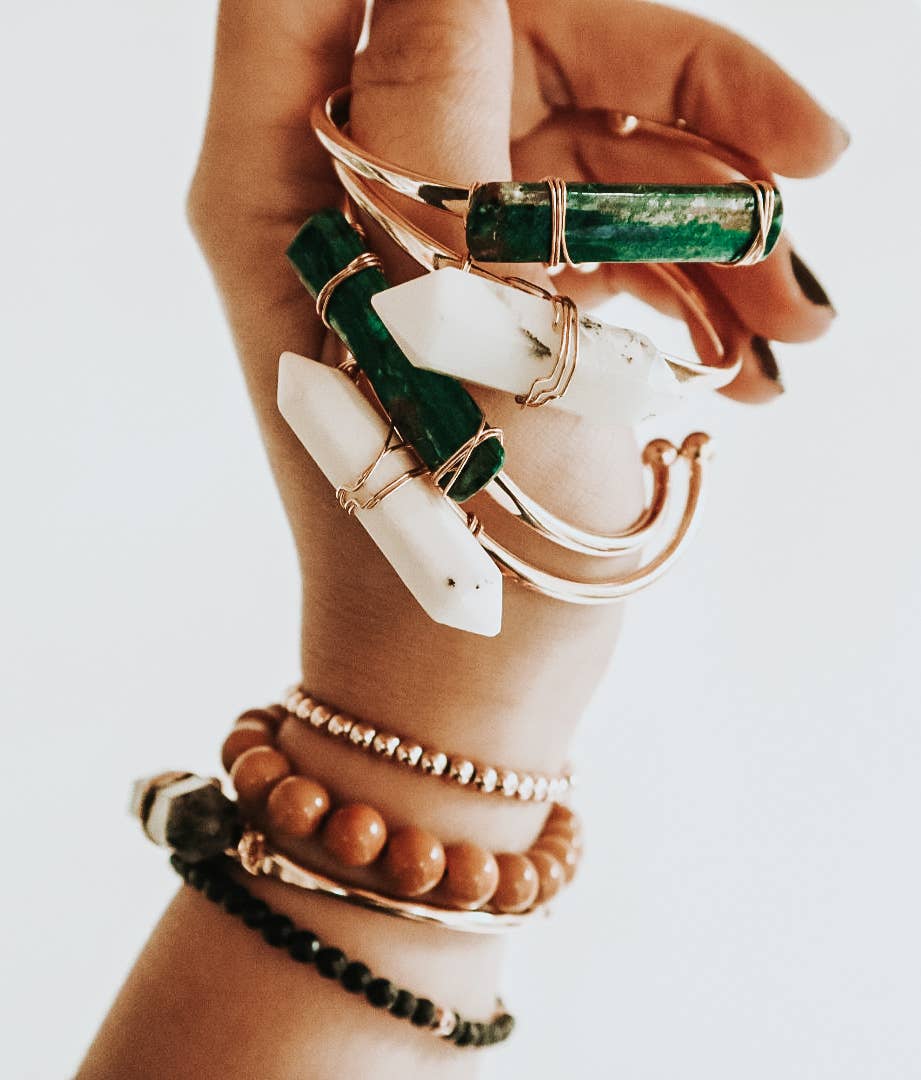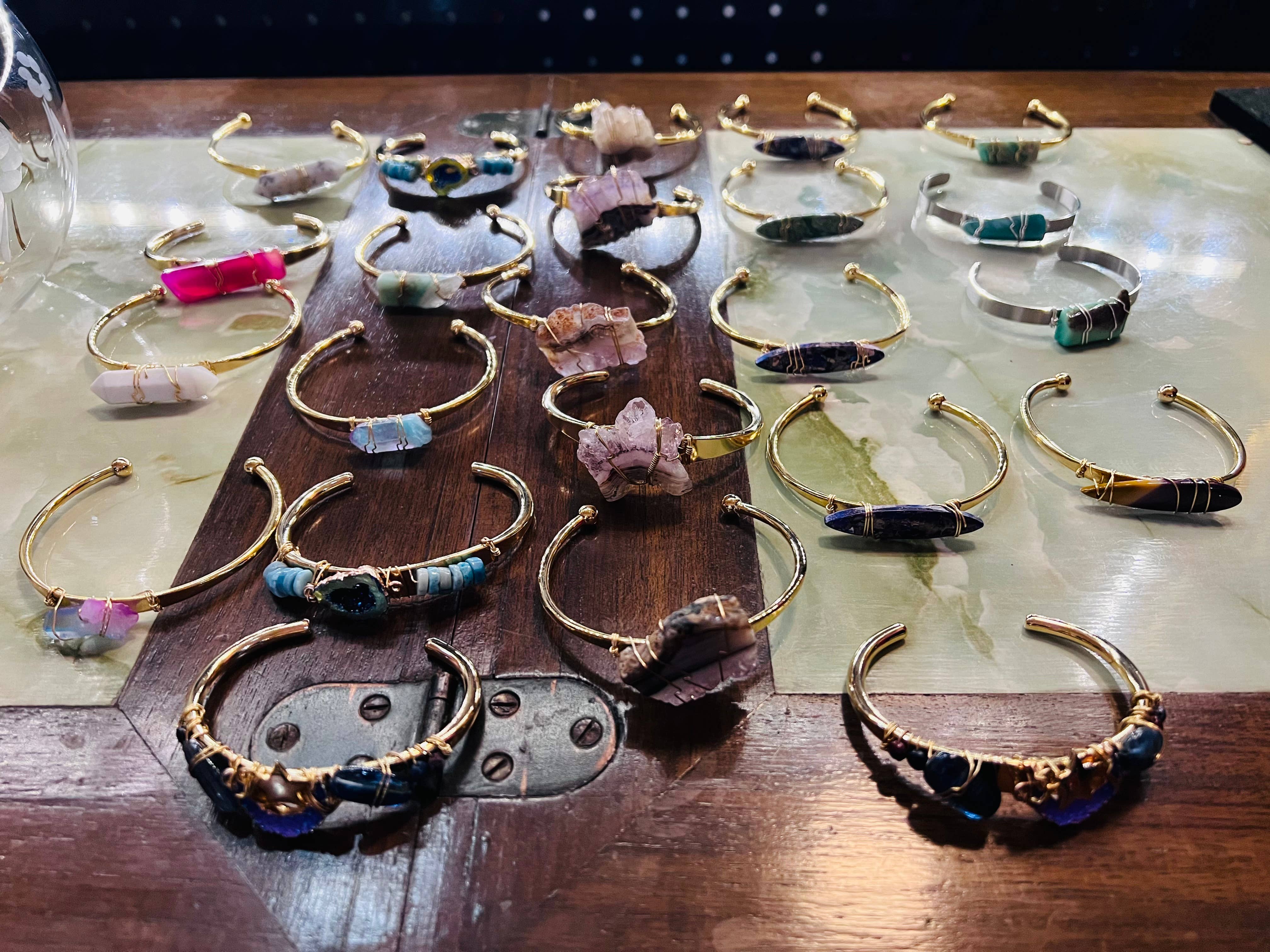 Handmade in NYC. Cuffs! An easy way to rock your favorite crystal. Brand new for Fall, this is the dainty version of our best selling crystal cuff. Gem stone crystals are securely and tightly hand wire wrapped to the vintage brass cuff base. These bracelets are too much fun to create and available in a rainbow of colors. First Main Photo-from left to right sky blue larimar, amethyst, rose quartz, clear quartz, green chrysoprase, tie dye quartz. Second Photo -from left to right, we have mookaite jasper, green jade, white opal, malachite and purple mosaic jasper. Please see our other listings for even more stone options. Adjustable for the best fit, cuffs best fit an average sized wrist and are 6 inches in total length.