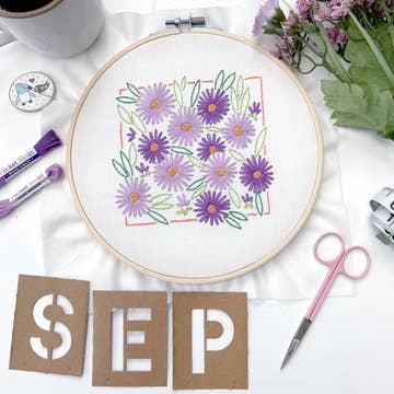 The September birth flower is the Aster! This flower is a burst of end-of-summer color and energy! The September Aster is great for beginner and seasoned crafters alike. This embroidery kit comes with everything needed to start stitching right out of the box, including pre-printed fabric and easy-to-read instructions. ----- Skill level: Beginner. You can do it! Pattern size: 5” x 5” (approximately 13 cm x 13 cm) Basic embroidery stitches used: backstitch, split stitch, lazy daisy stitch, and French knot The September Aster embroidery kit includes: * 1 - 10 1/2-inch fabric square, pre-printed * Pocket Skeins embroidery floss (enough to complete the project) * 1 embroidery needle * (1) 8-inch embroidery hoop * A high-quality color postcard of the finished embroidery * Detailed embroidery instructions including how to get started, a color and stitch guide, and basic embroidery stitches * The Penguin & Fish Embroidery Guide