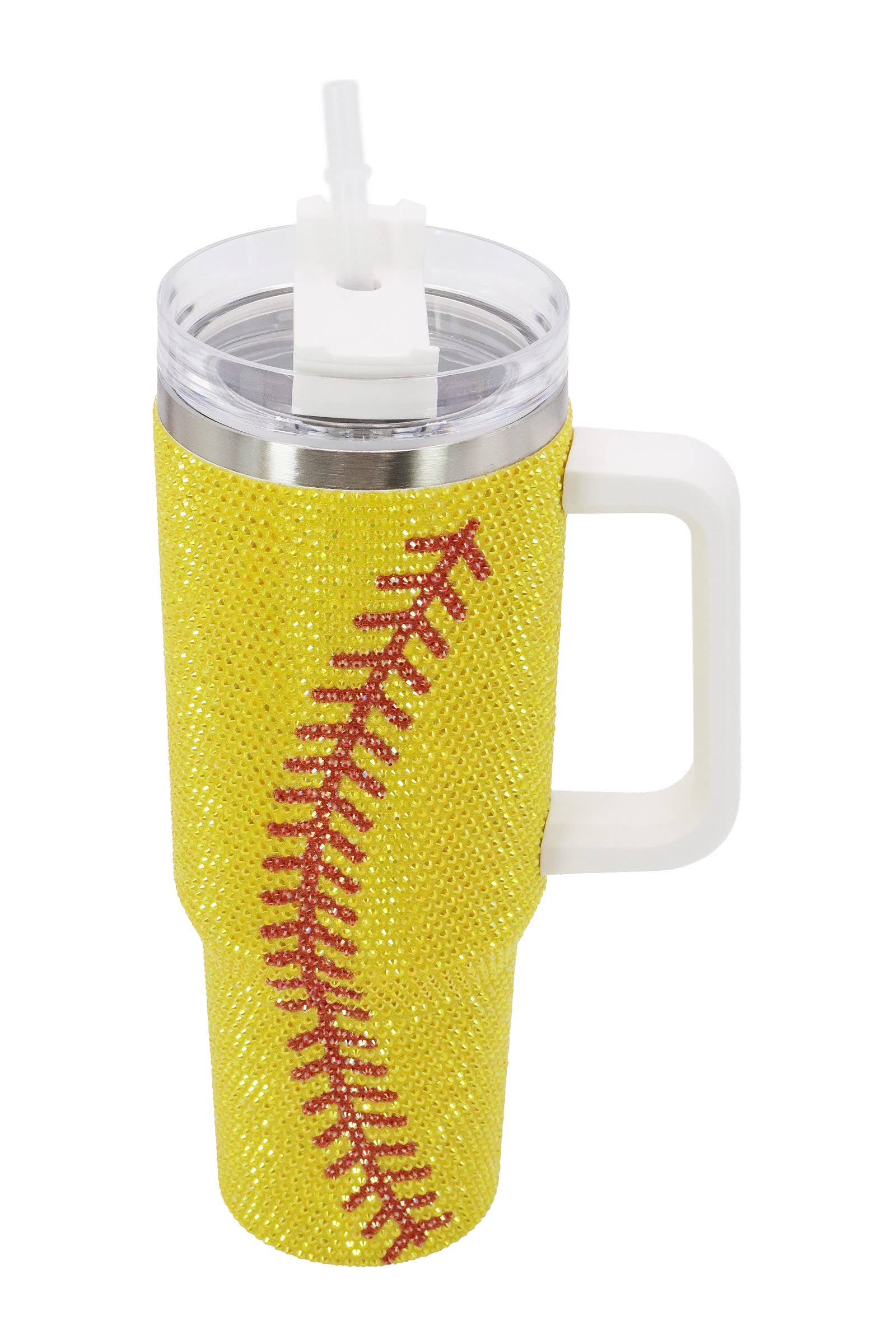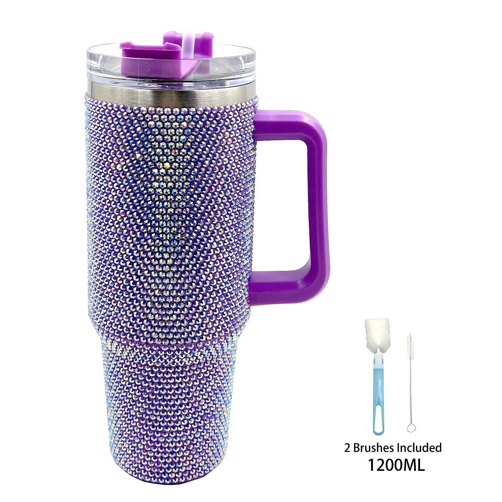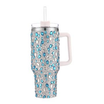 Bling Glam Rhinestone Embellished Double Wall Insulated Stainless Steel Tumbler Thermal Flask - 40 oz -Capacity: 1200 ml (40 oz) -Twist Closure Clear BPA Free AS Plastic Lid Featuring 3 Positions (Straw, Wide Mouth, and Full Cover) -Handle Dimensions: 4.75" * 1.25" * 1" -Tumbler Dimensions: 10.5" * 5" * 3.75" -Box Dimensions: 11" * 6" * 4" -1 x Straw Dimensions: 11.75" * 0.25" * 0.25" -Assorted Color (1-Black, 1-Sky Blue, 1-White, 1-Lavender, 1-Red, May Vary) -80% Stainless Steel, 20% AS Plastic -CA Prop 65 Advisory -Hand Wash Only -DISCLAIMER: Any items that arrive with imperfect packaging i.e dented box cannot be filed as defective so long as the item itself is intact.