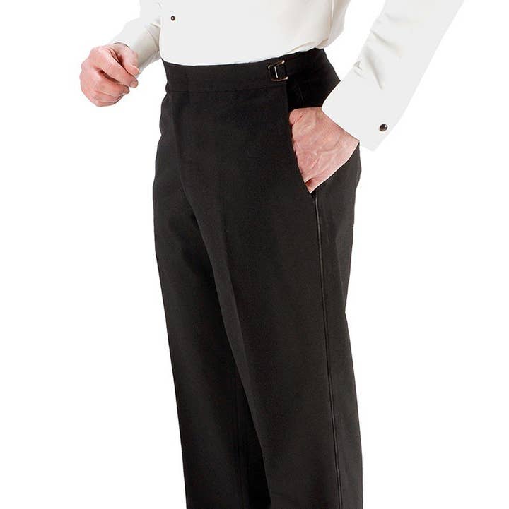 Pants - Rental Construction All rental construction pants include an adjustable waist feature (made with premium US-made components) to ensure a durable and reliable solution for the best in quality, made-for-rental tuxedo store. * Every man should own high-quality and classic tuxedo pants. Lucky for you, the Christophers are that pant! Made from a luxurious viscose blend (Super 150's to be exact), the Christopher tuxedo pants are not only comfortable but timeless. These plain front, solid pants have the classic tuxedo satin stripe going down the side of the leg; and are available in both modern and slim fit sizes making them a great option for any modern man. Color: Black Style: Plain Front Material: Luxury Viscose Blend (Super 150's) Pattern: Solid Formal Stripe: 1/8" Satin Stripe Designer: Cardi Fit & Sizes: Modern Fit (28 - 70) or Slim Fit (34 - 44) Condition: Brand new with original tags & packaging. Pants come unhemmed at the bottom so you can hem to your preferred length.