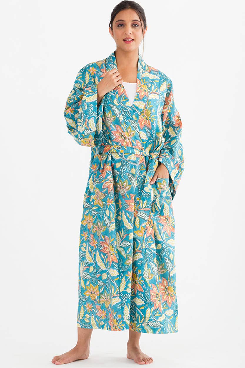 Sevya's Kimono Robes are printed on 100% soft cotton. Artisans in Rajasthan, India print the fabric for our fair trade robes using eco-friendly dyes. These beautiful cotton robes come in a range of colors and patterns, feature large pockets and are machine washable. One size fits most. -------------------------------- • Material: 100% Cotton • Care: Machine Wash in Cold Water Separately, Tumble Dry Low Heat • Dimensions: Length: 52 Inches (132 Centimeters) Shoulders: 27 Inches (69 Centimeters) Bust: 27 Inches (69 Centimeters) Sleeve: 28 Inches (71 Centimeters) Robe Tie Length: 84 Inches (213 Centimeters) --------------------------------