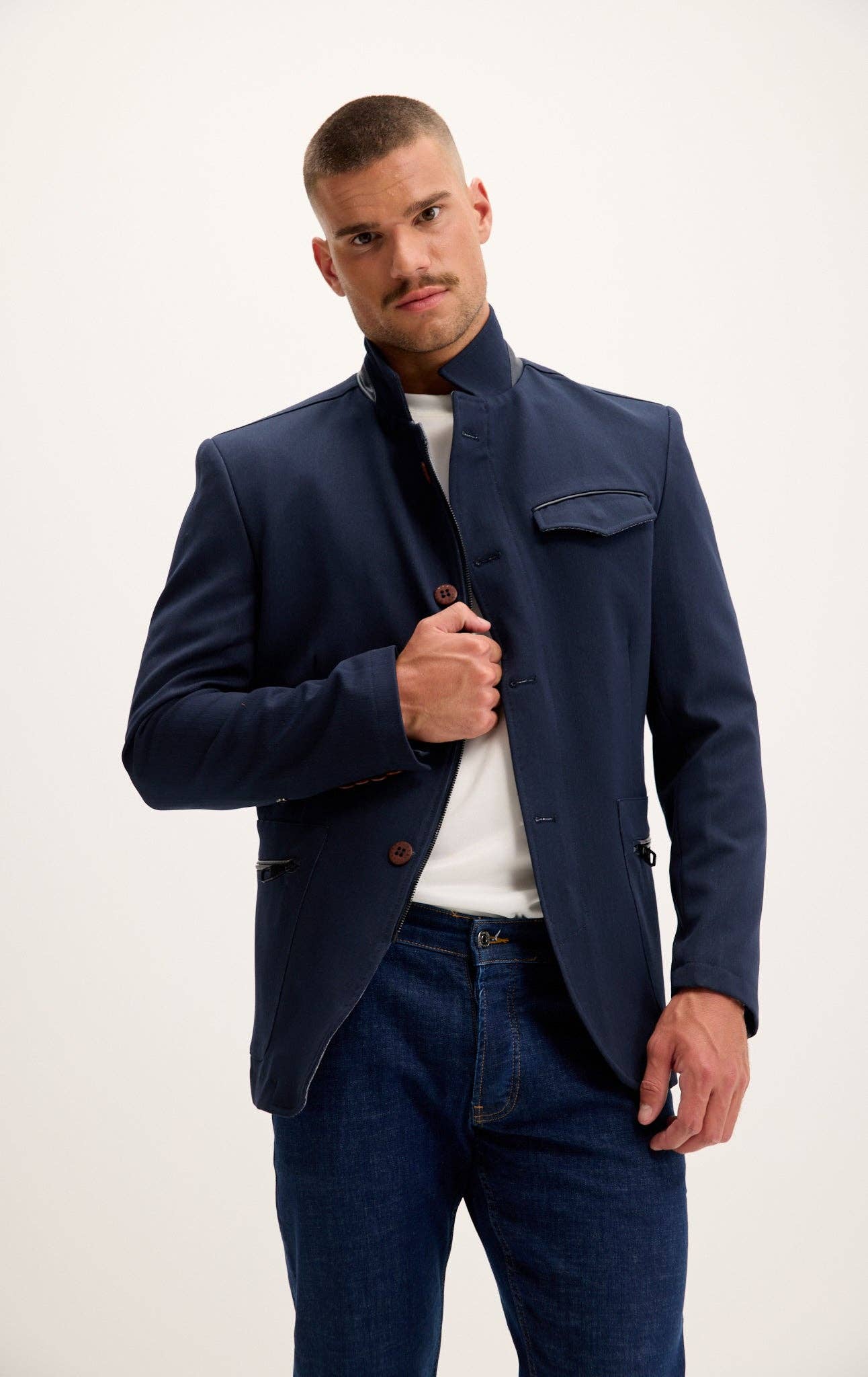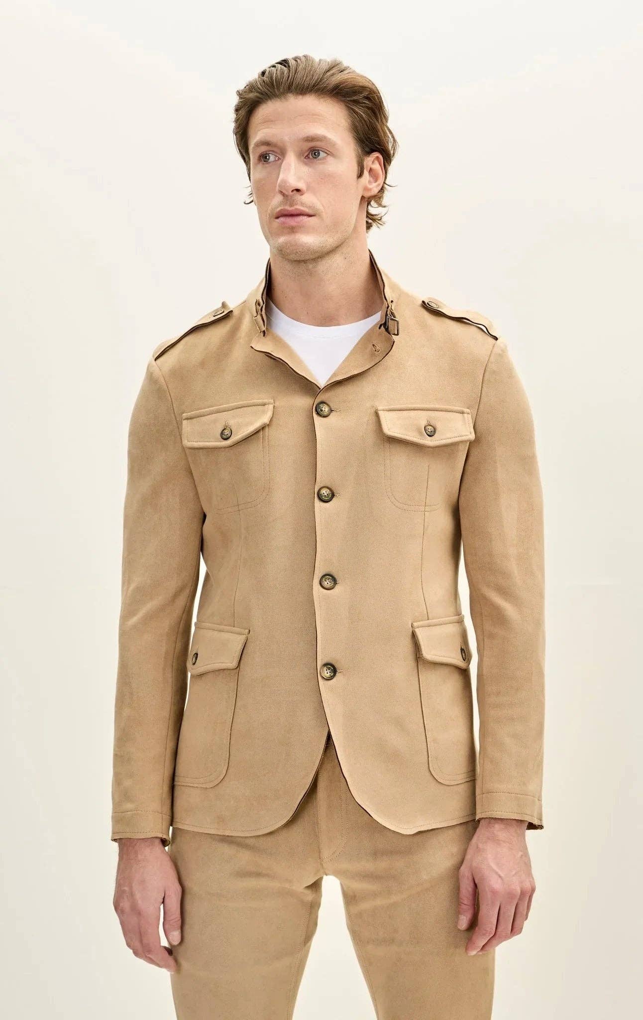 DETAILS Faux suede stand-up collar with buckle detail notch lapel when folded. 3-button closure, epaulets on the shoulder, and chest and side patch flap pockets. SIZE + FIT Tailored fit, to find your correct size use the "what's my size" button. COMPOSITION 91% Polyester 9% Elasthane Made in Turkey Style #5894 CARE Machine wash cold with like colors Do not bleach Cold water OTHER PRODUCTS ON THIS LOOK BY STYLE ID: Shirt: - Sneakers: 30652 Jeans: 1354