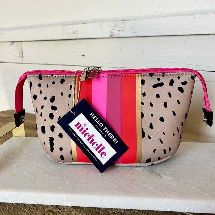 Confident, bold and fiercely loyal don't even come close to describing Michelle. I have been blessed to have a friendship with Michelle and her family. She loves all things pink and black and owns a successful cosmetic business, Skin Snob. (Her body butter and lip scrub are my favorites!) She is a Netflix junkie, a momma to 4 fantastic kiddos and loves jalapenos in her cocktails. Michelle would walk through fire for her friends and family. She is a cussing partner, travel buddy and probably has one of everything I have ever manufactured. The shades of pink and red with the antelope pattern made The Michelle a top choice among the wholesale markets. The internal neoprene has a smooth and streamlined look that is complemented by the rubber Taylor Gray logo on the pocket. Dimensions: Tote...23 inches wide (side panels expanded) x 12 inches tall x 11 inches deep Privacy pouch...8 inches wide x 5.5 inches tall x 1 inch deep