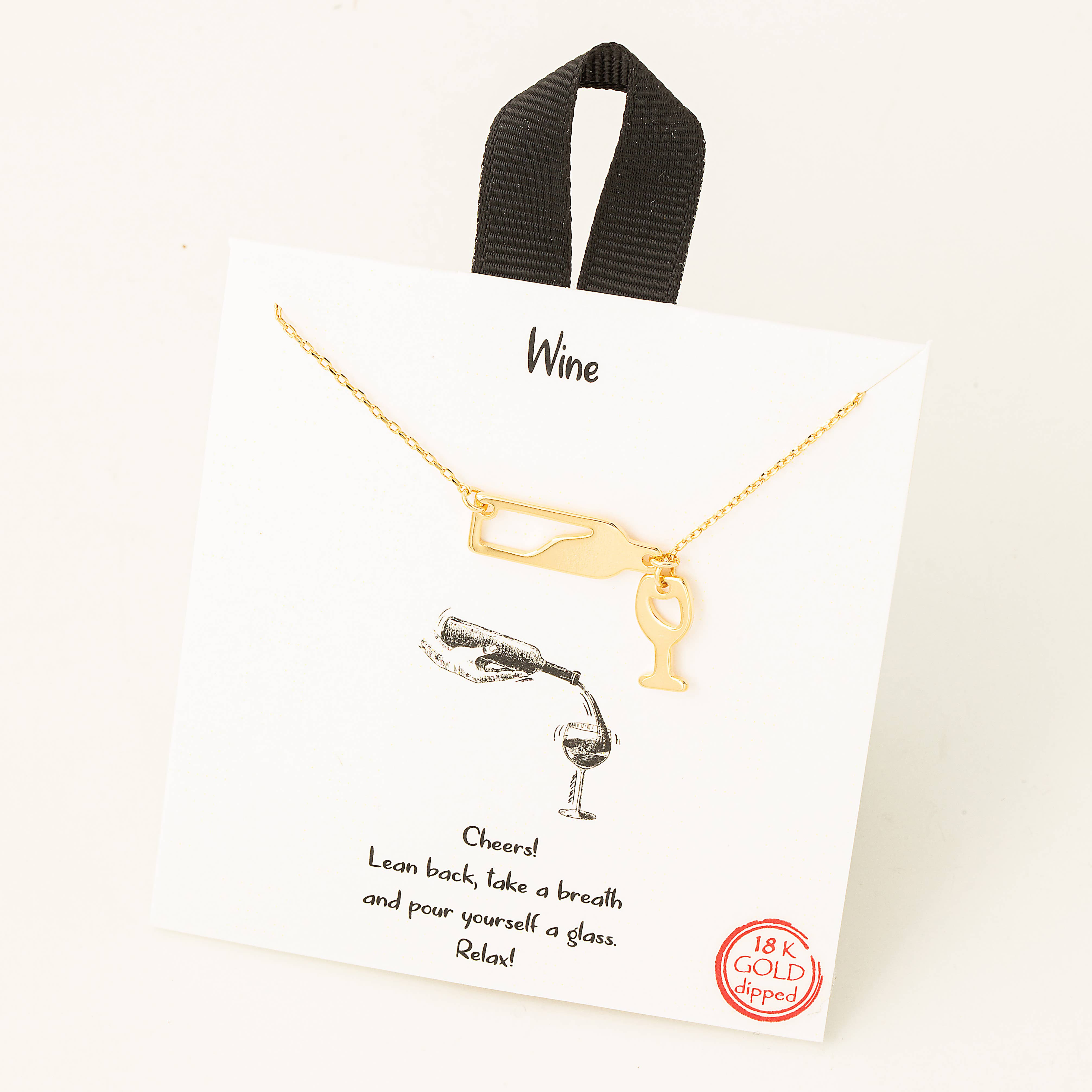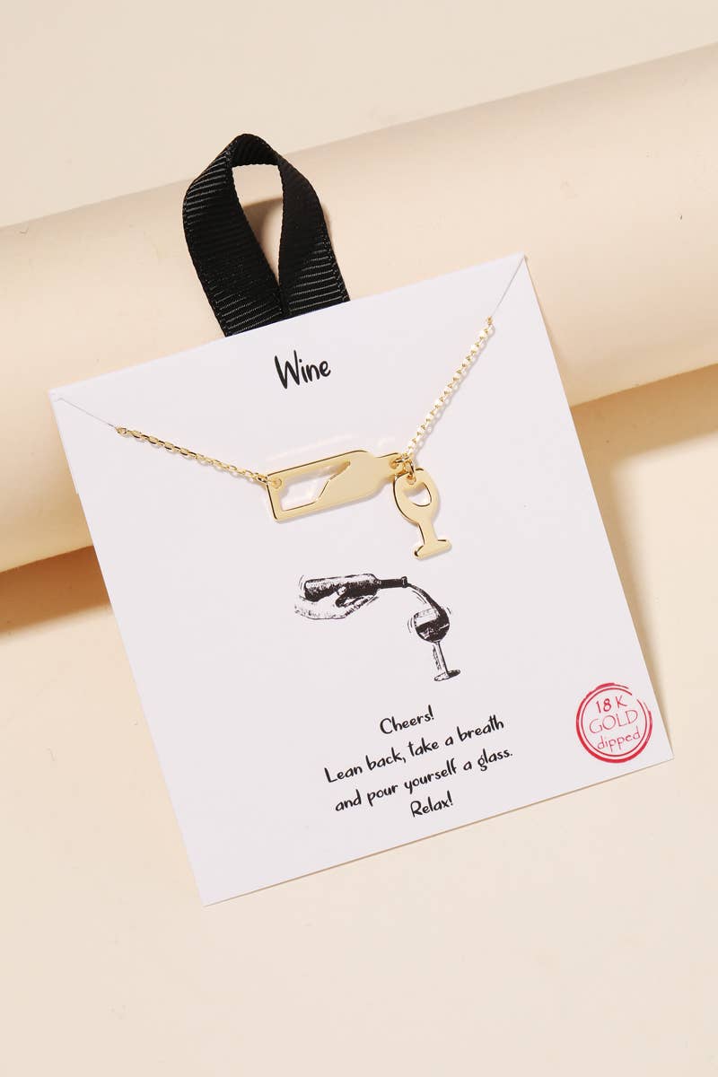 Necklace Size : 18" + 3" L Pendant Size : 0.7" X 1.75" Lead and Nickel Compliant Bold outline pendant featuring a wine bottle and glass design on a delicate chain. A fun, statement piece perfect for wine lovers or themed gifting.