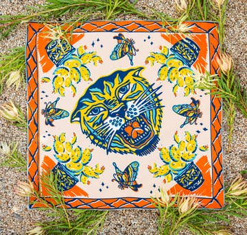 Leopard, and the Sun Bandana Scarf (Off-White/ Redesigned) *Etsy's Pick* Illustrated Leopard, the Image of the Sun with Tropical Flowers by S0l • Size: 22"x22" (approx.) • 100% soft, lightweight, breathable Cotton/ wearable throughout the whole year **This is not a typical bandana. lighter in weight compared to the typical bandanas but has better quality cotton for the best hand feel. It feels more like a scarf or handkerchief.** • Machine rolled hem • One-sided printing • Care: Hand cold wash recommended, Do not bleach, Hang to dry
