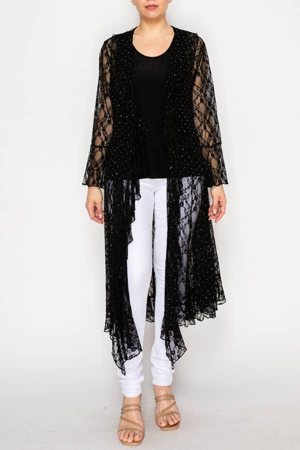 Description Add a little bling to your outfit! The Priscilla Jacket features little gemstones throughout the body. This easy style is the perfect piece to enhance a simple outfit. Features * High-low hem * Long sleeves * Open front Material and Fit Fabric: 95% Bamboo, 5% Lycra Length Measurements, Top of Shoulder to Bottom of Hemline XXS XS S M L XL 1X 2X 3X 4X cm 110