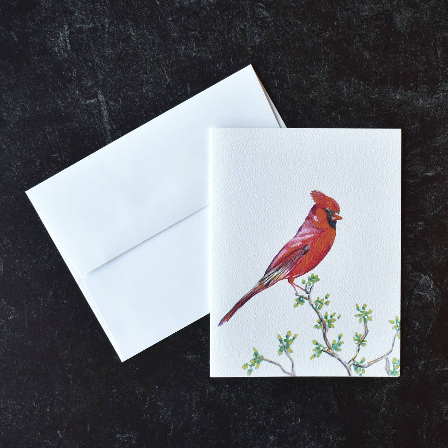 A card featuring my watercolor of a male cardinal - 5x7" standard size Greeting Card - Blank Inside - Envelope included - Protected in clear sleeve - High quality, sturdy card stock