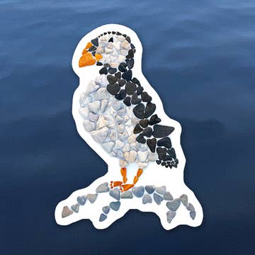 Watercolor and ink illustration of an Atlantic Puffin, on a blue background. Measures 3.5″ × 3.28″. Created by Claire Loon Baldwin. Sticker is high-resolution and made of durable vinyl. Resistant to rain and UV, scratching. Dishwasher safe. Don't forget to follow on Instagram: @claire.loon.baldwin