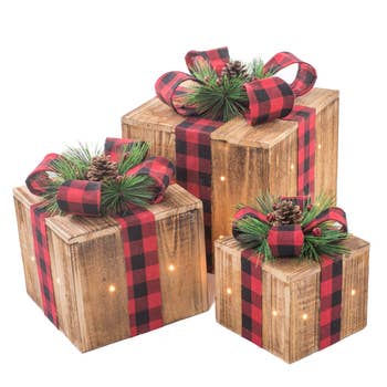 Plaid Chunky Wood Christmas Tree features an assortment of three Christmas tree sitters. Tree is made of wood and features a green and white, black and white, or red and black plaid fabric covering with natural sides. It is accented by a metal star finial on top and a wooden tag that is held by jute and reads, "merry," "jingle," or, "jolly" in red, black, or green lettering. Please note: This item features an assortment of designs which are priced individually, not as a set. When you purchase a case quantity of 6, you will receive 2 of each design when available.