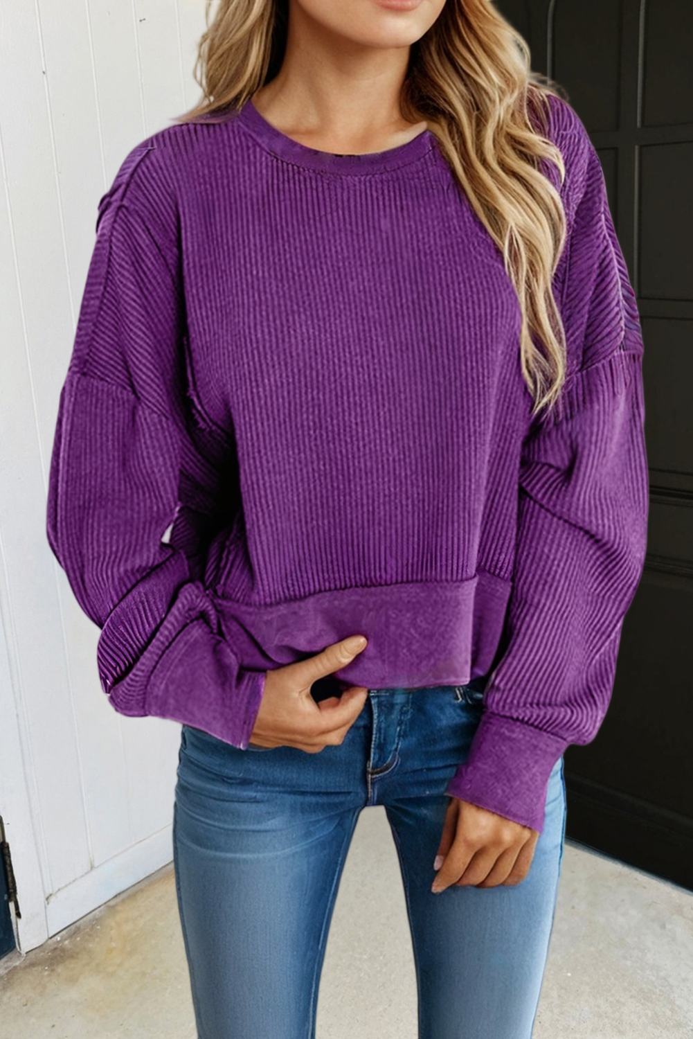 Super soft fleece material oversized sweatshirt with wave rib contrast on the neckline, cuffs, and hem. It features a mock neck with a side slit on the collar, a drop shoulder design for a casual and effortless look, the oversized fit adds comfort and modern style. Paired with white pants, it creates a chic and clean outfit perfect for everyday wear.