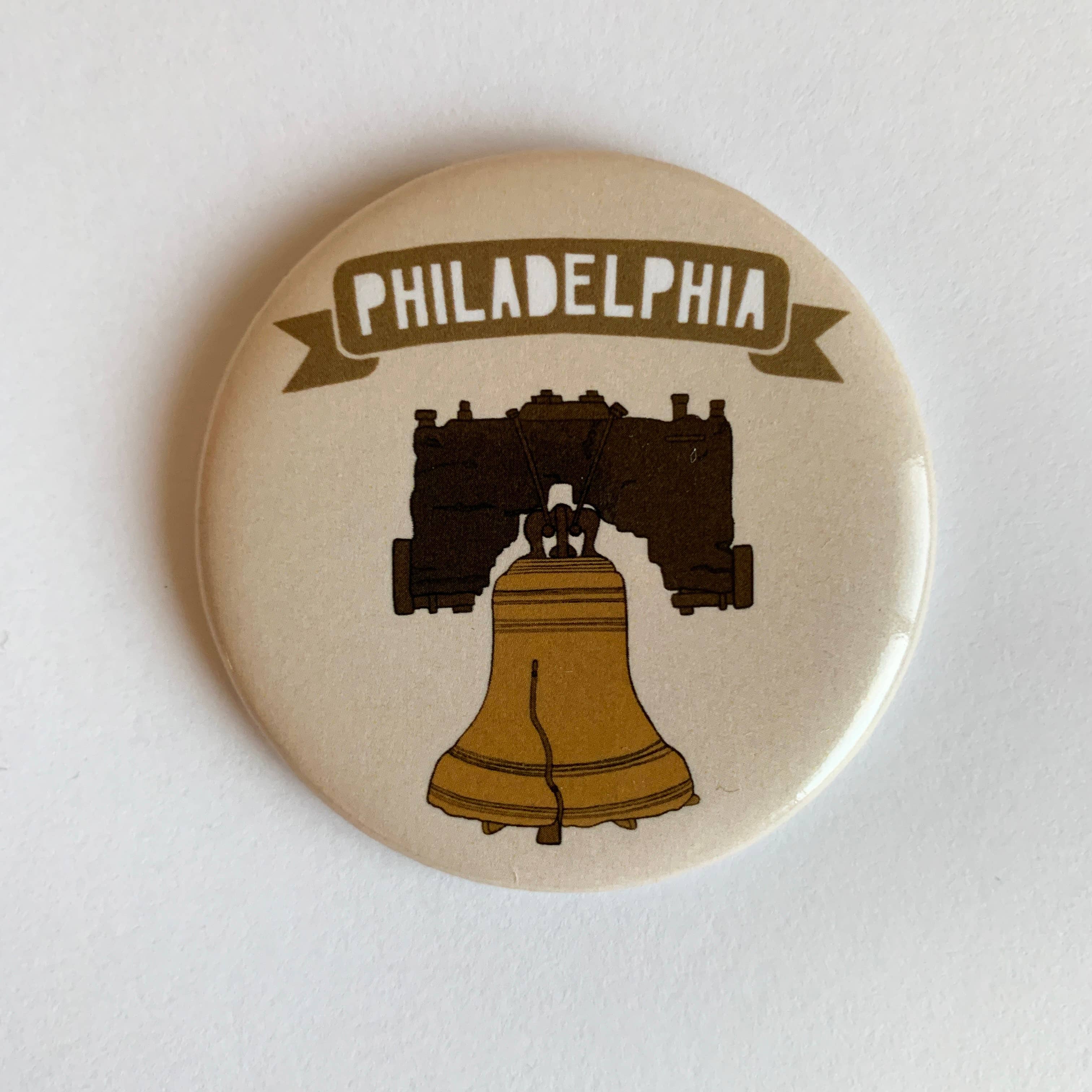 This magnet is an ode to the iconic brick row houses of Philadelphia. It features an illustrated rendition of three homes against a beige background. Above it reads Philadelphia in navy blue cursive. This circular magnet measures 2.25 inches around and is sealed in with a plastic mylar sheath.