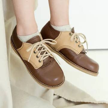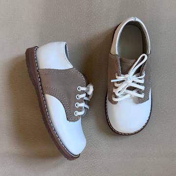 The Albert Saddle is made of white and ecru leather and lined with breathable leather and cotton which work together to draw out any moisture. This style features a textured rubber sole. The structure of the shoe and the flexible sole provide stability without weight to support your child's early steps. The perfect style to dress up or down!